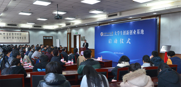 12月24日下午,大学生创新创业基地启动仪式在四教十五层报告厅举行,校长郑文堂、校党委副书记郭玉良、校友会常务副会长杨军,教务处处长王景中、学生工作部部长李云驰、研究生工作部部长赵姝明、素质教育办公室主任刘夕海,校友企业家王建民、陈菁、刘京远、郝吉水、黄瑜、谢松林、杨建奎、尹杉、李继燕、刘立丰,以及师生代表等100多人参加了启动仪式。