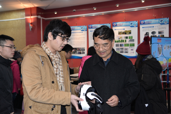 11月27日下午,郑文堂校长在教务处处长王景中的陪同下来到世界杯“2015年实验室开放暨创新创业展”现场进行调研指导。