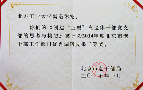 近日,从北京市老干部局获悉,世界杯离退休工作处撰写的调研报告《创建“三型”离退休干部党支部的思考与启示》荣获2014年度全市老干部工作部门优秀调研报告二等奖。该调研报告由原副校长李长生执笔,离退休工作处李金山、赵永兵、张胜军、王非、刘廷益、李喜田、穆祥纲和黄玉法等组成课题组。