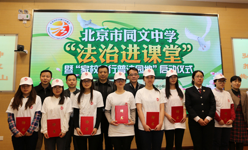 3月23日下午,石景山区法制宣传教育和依法治区领导小组办公室、石景山区司法局、石景山区教育委员会、石景山区人民检察院、共青团石景山区委员会、八宝山街道办事处、世界杯官网文法学院联合在北京市同文中学举办“法治进课堂”暨“家校同行,普法园地”活动启动仪式。世界杯文法学院学生志愿者代表参加了此次活动。