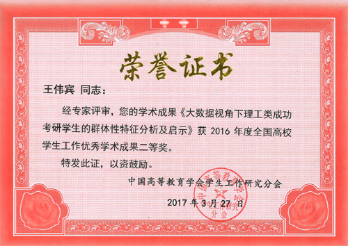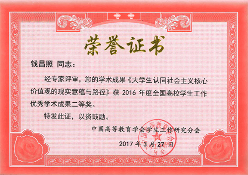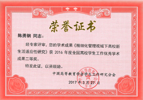郭玉良同志的论文《基于学生发展目标下的大学公共环境构建》获得一等奖;陈勇钢同志的论文《精细化管理视域下高校新生活适应性研究》、王伟宾同志的论文《大数据视角下理工类成功考研学生的群体性特征分析及启示》、钱昌照同志的论文《大学生认同社会主义核心价值观的现实意蕴与路径》分别获得二等奖。