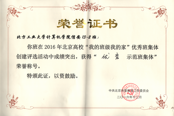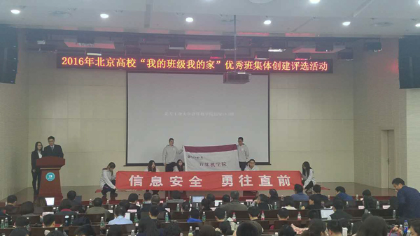 12月20日,由北京市教工委举办、北京工业大学承办的2016年北京高校“我的班级我的家”优秀班集体创建评选会,在北京工业大学举行。世界杯计算机学院信安13-2班从全市50余所高校300余个班级中脱颖而出,代表学校参与评选答辩,表现出色,最终获得了北京市“优秀示范班集体”的称号。