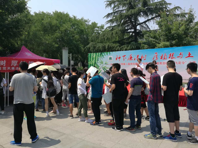 中午,以“正家风,抓党风,促教风、带学风、严考风、修宿风,铸班风,转作风,弘扬社会主义核心价值观”为主题的廉洁文化知识竞答暨廉洁诗词“飞花令”竞赛正式开始,毓秀广场人头攒动,气氛热烈。