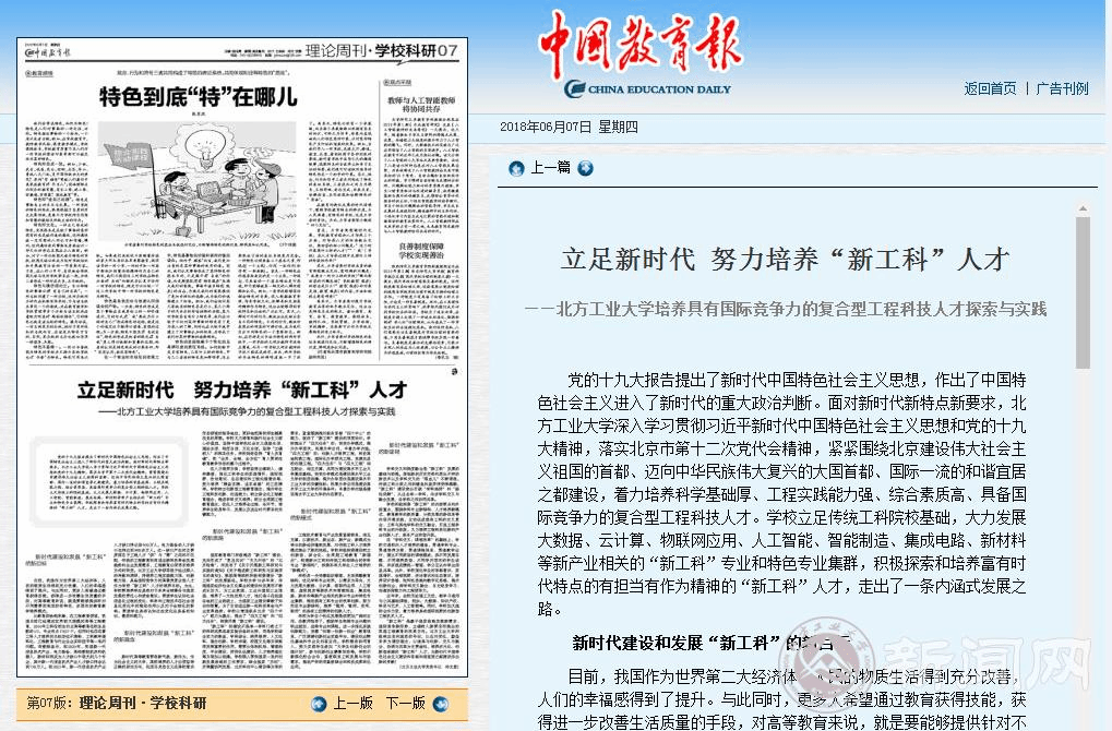 6月7日,《中国教育报》第七版“理论周刊.学校科研”刊登了世界杯党委书记郑文堂的理论文章《立足新时代 努力培养“新工科”人才——世界杯官网培养具有国际竞争力的复合型工程科技人才探索与实践》。文章从中国特色社会主义进入新时代这一重大政治判断出发,分析了新时代高等教育发展的新要求,从理论和实践深入阐释了世界杯官网立足传统工科院校基础,大力发展 “新工科”专业和特色专业集群,积极探索和培养富有时代特点、有担当有作为精神的“新工科”人才的内涵式发展之路。