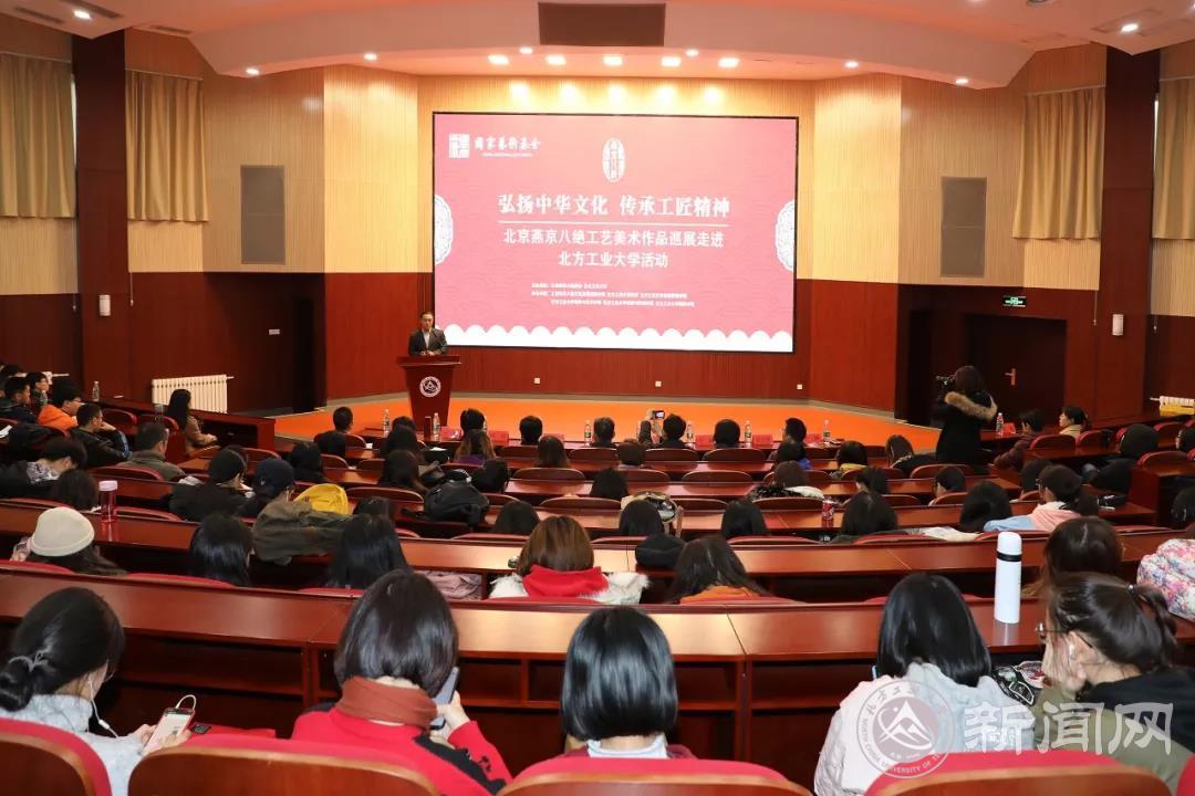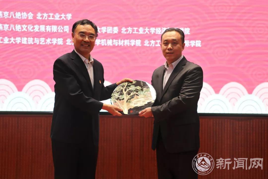燕京八绝传承人万紫大女士和北京燕京八绝协会常务副会长柏群老师分别致辞。万紫女士表示,党的十九大以来,在党和政府的政策指引和社会各界的积极推动下,燕京八绝事业得到了长足的发展。她希望未来所有的非遗传承人继续秉持着“敬业、精益、专注、创新”的工匠精神,努力创作具有传统工艺和北京特色的燕京八绝艺术精品。柏群副会长在致辞中表示,燕京八绝从2010年结缘西山永定河文化带,在石景山区的千年古刹承恩寺建立了燕京八绝的艺术馆。多年来,燕京八绝与北方工大都是好伙伴和好邻居,希望通过此次活动,搭建起校企合作、传承文化、传播文明的平台,为石景山区的文明创城事业、为首都四个中心建设,为中华文明的薪火相传,在各自的领域做出新的更大的贡献。