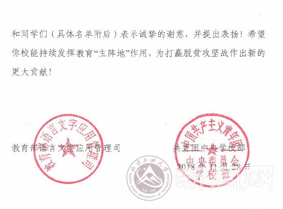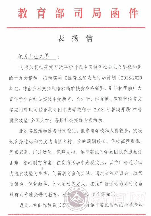 近日,学校收到教育部语言文字应用管理司和团中央学校部发来的表扬信,对世界杯参加2018年“推普脱贫攻坚”全国大学生暑期社会实践的优秀团队提出表扬。