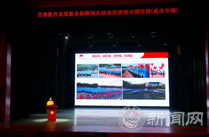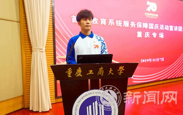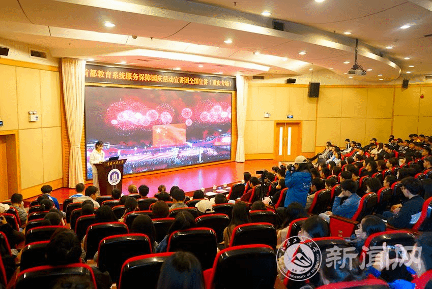 宣讲团成员辅导员库颖,群众游行学生代表蒋云飞、江泠睿,联欢活动学生代表张震、祖力哈亚提·艾力,国庆志愿者学生代表付潼,后勤保障组学生代表邱佳汇,向与会师生分享了服务保障国庆活动的精彩过程,生动的故事、动情的讲述,引发了重庆师生的强烈共鸣。