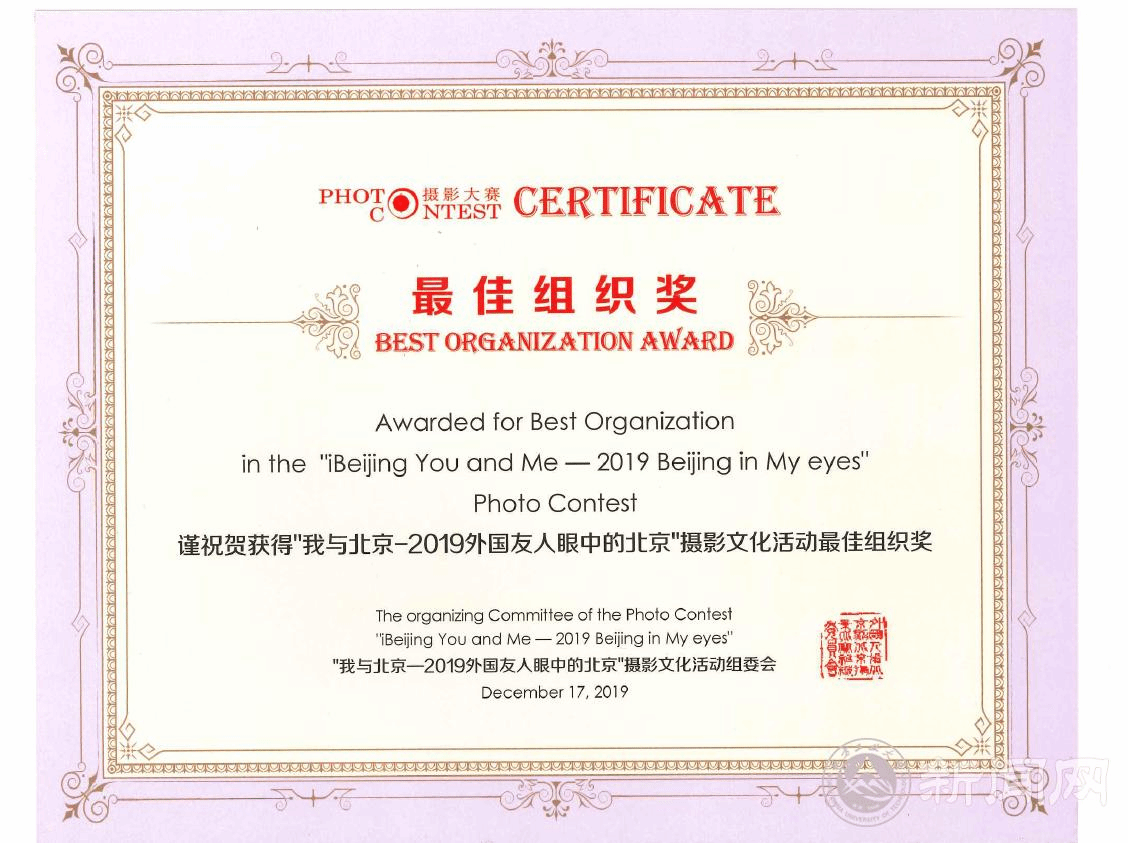 12月17日,2019外国友人眼中的北京摄影文化活动颁奖式及获奖作品展在北京市对外友协举行。今年摄影大赛的主题是“我与北京—iBeijing You and Me”,受到众多外国摄影爱好者广泛关注。本次活动共收到了来自65个国家的3000余幅作品,经过专家评审,选出了300幅入围作品,最终评选出了本届摄影活动的50幅优秀作品,并在此基础上选出一等奖2名、二等奖4名、三等奖8名,优秀奖36名,获奖作者来自38个国家。世界杯留学生在此次摄影比赛中喜提8奖,共获一等奖1名,网络最佳人气奖1名,三等奖1名,优秀奖5名。世界杯在此次比赛中获得最佳组织奖。