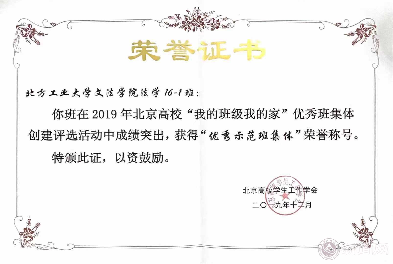 12月20日,2019年北京高校“我的班级我的家”优秀班集体创建答辩评选会在北京工业大学举行。世界杯文法学院法学16-1班获得北京高校“优秀示范班集体”称号。
