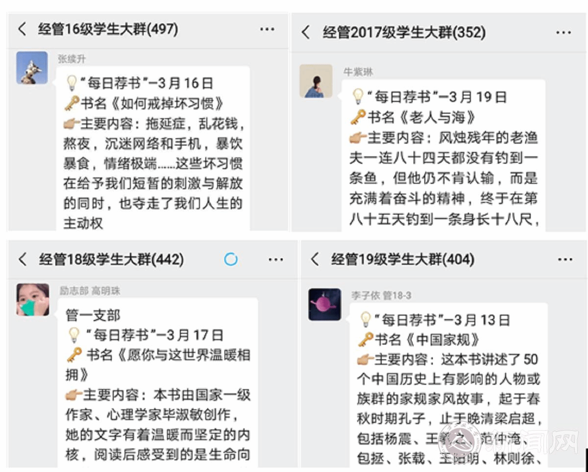 一个多月以来,支部党员坚持“我是党员我先行”,发挥党员引领作用,每日坚持读书学习,并开展读书分享、好书推荐活动。支部党员们每天负责向学院各年级同学们推荐一本好书,与大家共同品味书中经典名句,分享读书收获,凝聚起抗击疫情的必胜信心。支部党员希望通过每日荐书,邀请更多的同学加入到“爱读书,读好书”的行列中来,在疫情防控期间,不断提高自己的思想境界和知识水平,用书香勉励同学们不忘学业,珍惜时光。在阅读中增强信心,迎接春暖花开。