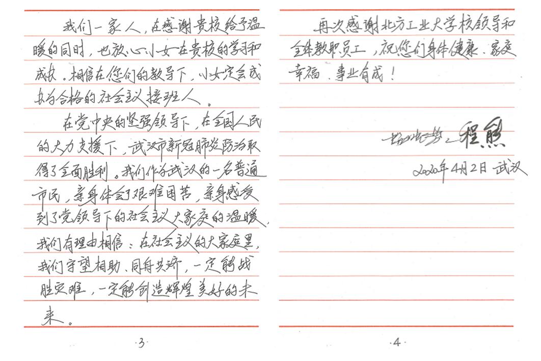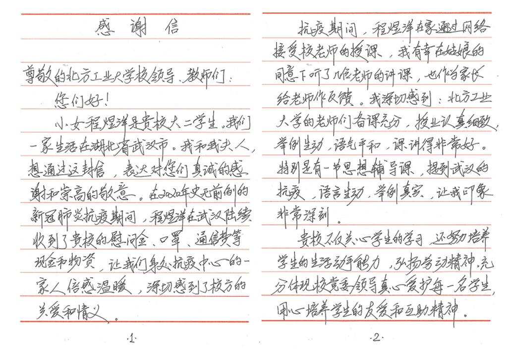 “小女程煜洋是贵校大二学生。我们一家生活在湖北省武汉市。我和我的夫人,想通过这封信,对您们表达真诚的感谢和崇高的敬意。在2020年史无前例的新冠肺炎抗疫期间,程煜洋陆续收到了贵校的慰问金、口罩、通信费等现金和物资,让我们身处抗疫中心的一家人倍感温暖,深切感到校方的关爱和情义……”。这是4月3日信息学院辅导员杨和家收到的一封来自通信18-3班程煜洋同学家长的感谢信,全文600余字,饱含了身处武汉抗疫中心的一家人对学校学院在疫情期间给予关心关爱的深切感激之情。