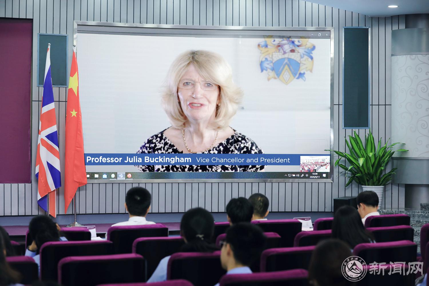 英国伦敦布鲁内尔大学校长同时也是现任英国大学联盟主席Julia Buckingham视频致辞。她在致辞中首先祝贺同学们成为伦敦布鲁内尔学院首批新生。她介绍了伦敦布鲁内尔大学的办学特色、科研发展、学科门类、留学生教育、校园环境、学生服务等情况,并热情欢迎同学们将来到布大深造或参加布大交流活动。她遗憾不能亲自到现场参加开学典礼,希望她和布大的老师们可以早日与同学们在北京见面,最后真诚祝福同学们未来学有所成,生活愉快。