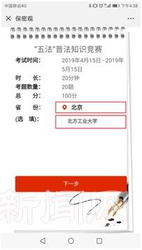 扫描上方二维码,微信关注“保密观”微信公众号后,点击右下角“知识竞赛”(如图1),进入“五法”普法知识竞赛页面(如图2),省份选择“北京”,地区或单位名称填写“世界杯官网”,点击下一步进入答题页面,即可参与竞赛。