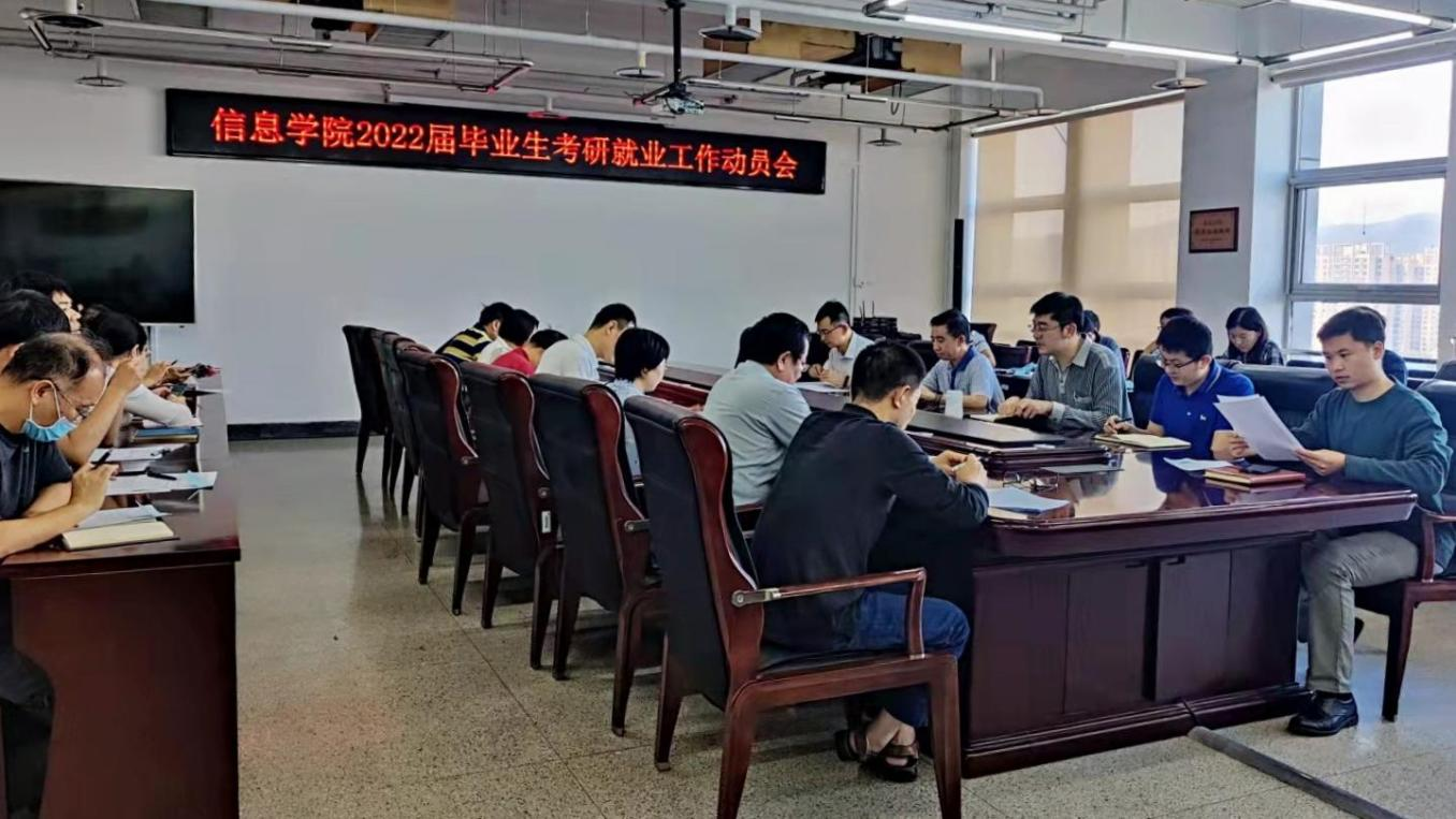 为推动学院人才培养质量再上新水平,扎实做好毕业生考研、就业指导工作,信息学院于9月27日召开2022届毕业生考研就业工作动员会,学院领导班子、各系主任、2018级班导师及专职辅导员参加,学院党委副书记赵帅主持。