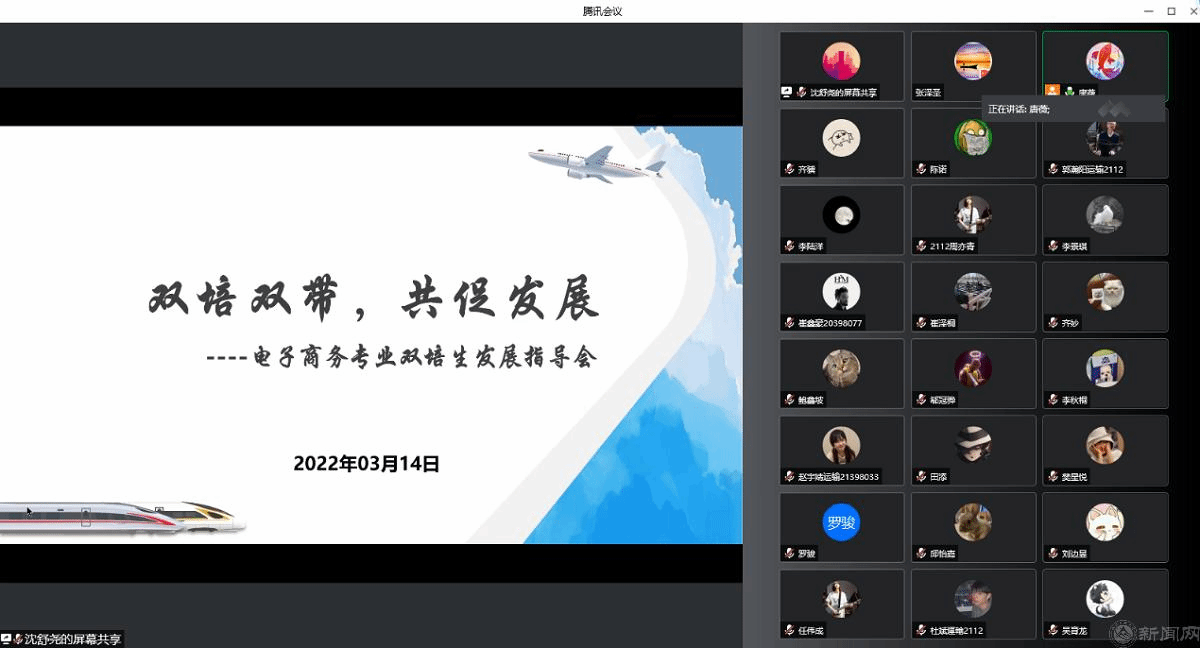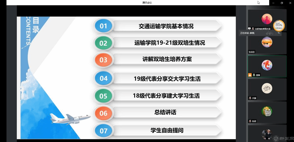 唐薇主任介绍交通运输学院发展沿革、专业设置、本科生培养以及19-21级双培生在校期间的学习生活就业等情况,经济管理学院党委副书记赵洁老师在课程学习、疫情防控等方面对学生做出指导,经管学院副院长陶晓波老师解读了新修订的双培生培养方案,18级、19级双培生代表分享在交大的学习生活。会议最后的提问环节,各位参会老师对学生比较关心的学分认定、课程替换、考研等问题进行解答。