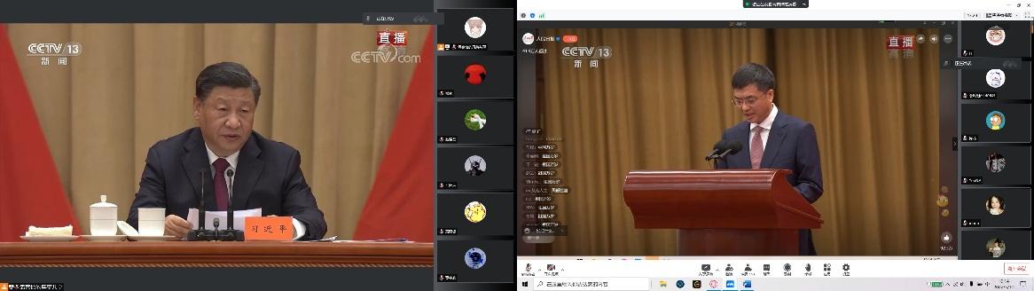 在博才楼203会议室,学院党委书记王文革、副院长刘东与师生代表认真收听收看大会直播,深入学习习近平总书记在庆祝大会上的重要讲话精神,深刻感悟党领导中国青年运动的百年历程。在聆听了习近平总书记重要讲话精神后,与会师生交流了收看体会。