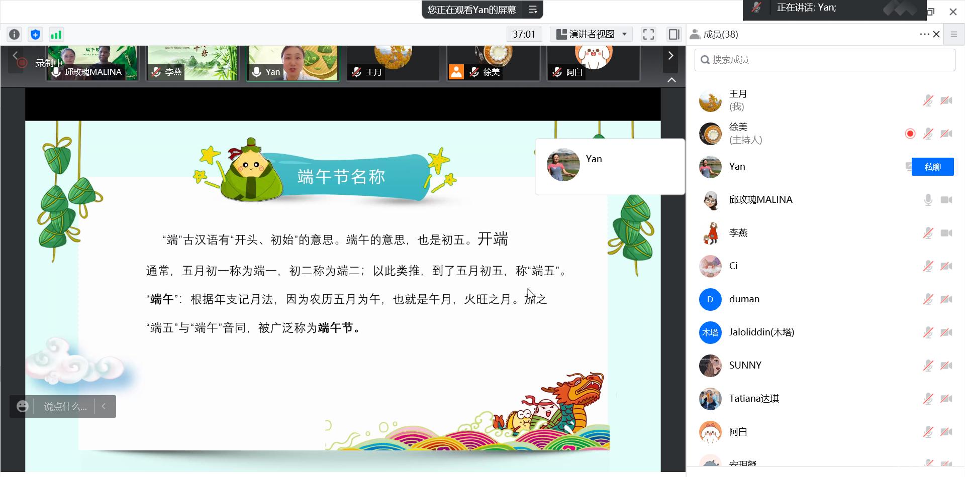 津巴布韦籍留学生歌真表示这次线上过端午节非常“独一无二”,在学习各种知识的同时还交到了新的朋友,她感谢老师们精彩的演讲和充满热情的展示,表示非常期待下一次活动。
