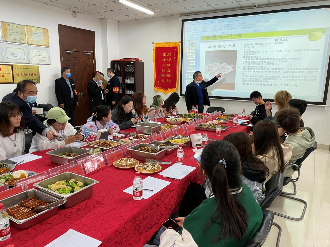 各食堂经理结合PPT幻灯片,以图文并茂的形式依次向同学们介绍本次推新菜品的创意思路、制作方法、售价和菜品特色。学生评委们对推新菜品进行试吃,结合成本核算,从色、香、味道、投料、价格等方面进行评分。饮食服务中心将通过学生评分结果计算出推新菜品通过率,推选出学生喜欢的创新菜品,逐步安排到周食谱中。