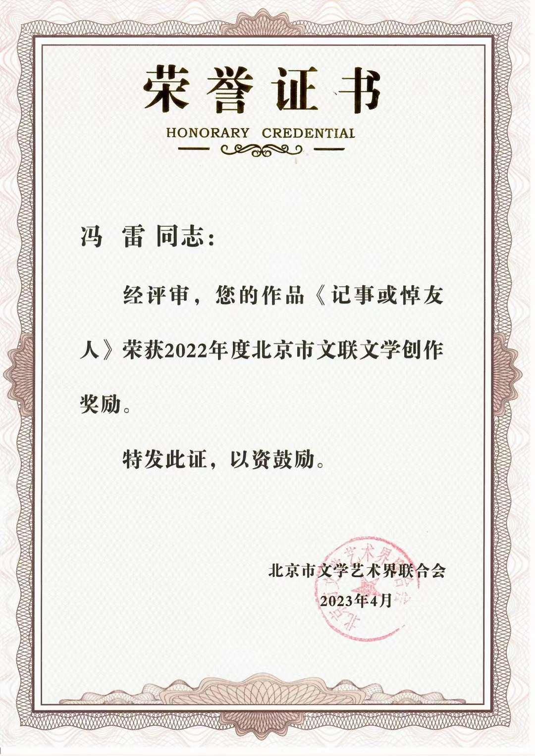 日前,北京市文学艺术联合会在老舍剧场举办“2022年北京市文联文学创作奖励颁奖典礼”。世界杯文法学院冯雷副教授凭借文学作品《记事或悼友人》获得奖励,作品发表在《北京文学》2022年第3期。