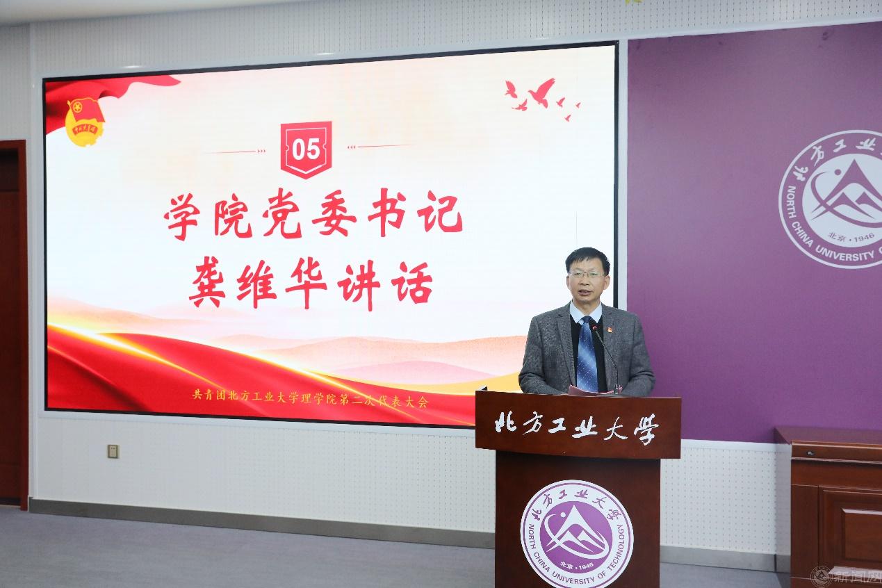 龚维华代表学院党委讲话。他对学院第二次团员代表大会的召开表示祝贺,对校团委长期以来支持理学院团学工作建设发展表达了感谢,对学院过去五年的团委工作表示肯定,并向学院全体青年团员、团干部提出三点希望:一是要打牢政治根基,强化党的领导。共青团是党的助手和后备军,广大青年要做到党旗所指、团旗所向,在政治上接受党的领导,思想上不断深入学习党的理论,在行动上响应党的号召,以饱满的精神状态和坚定的奋进姿态,在新征程上创造新业绩、展现新作为、彰显新担当;二是要突出能力建设,重在从严治团,共青团是理学院学生的先锋力量,必须立志做光荣传统和优良作风的忠实传人;三是要强化使命担当,服务学校建设。在学校发展的宏伟蓝图中,学院共青团使命光荣,责任重大。我院团组织要当好沟通学校与学生的桥梁,聚力理科新型人才培养,在建设高水平应用型大学的征途中当先锋、做闯将,写下理学院绚烂的青春之笔。