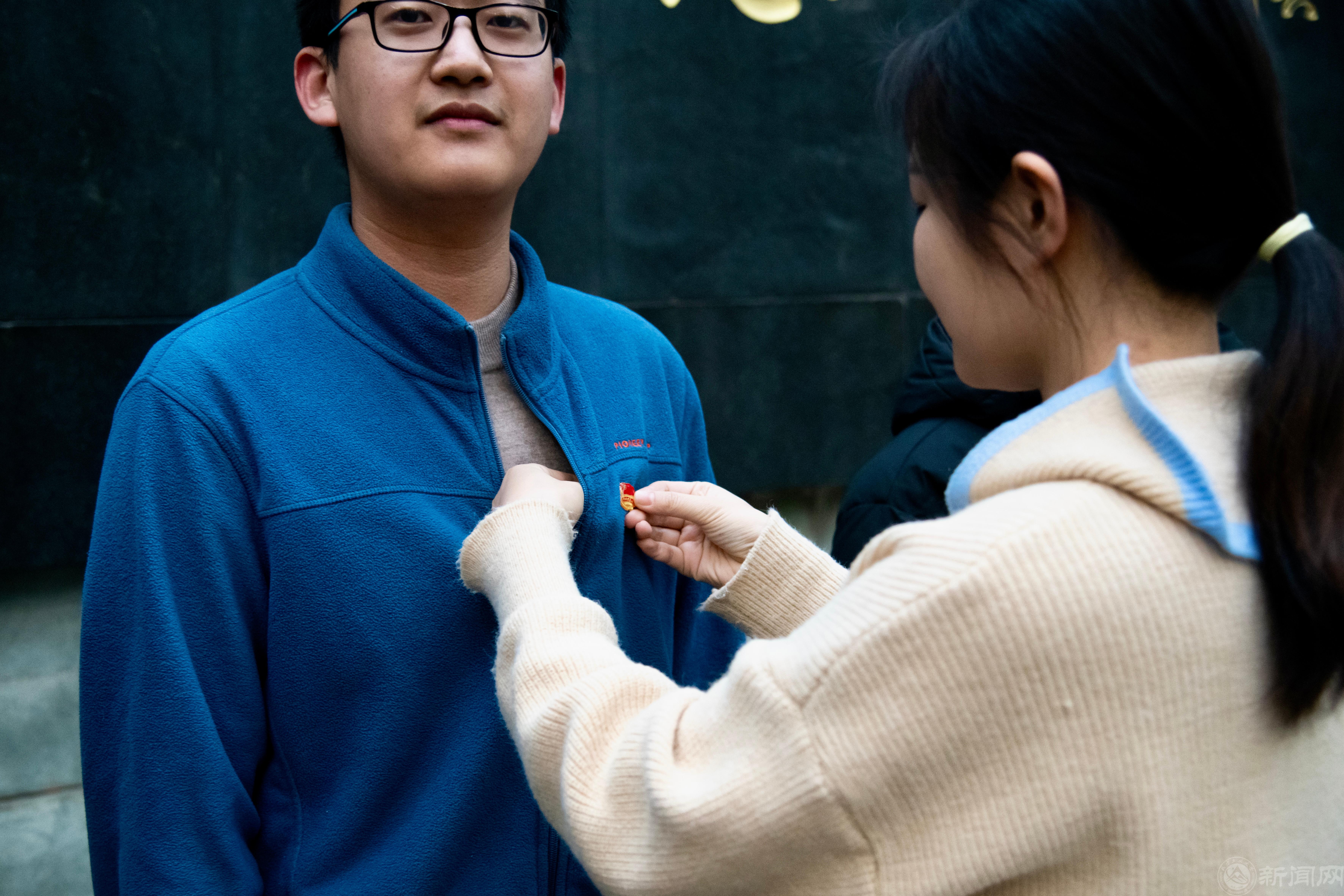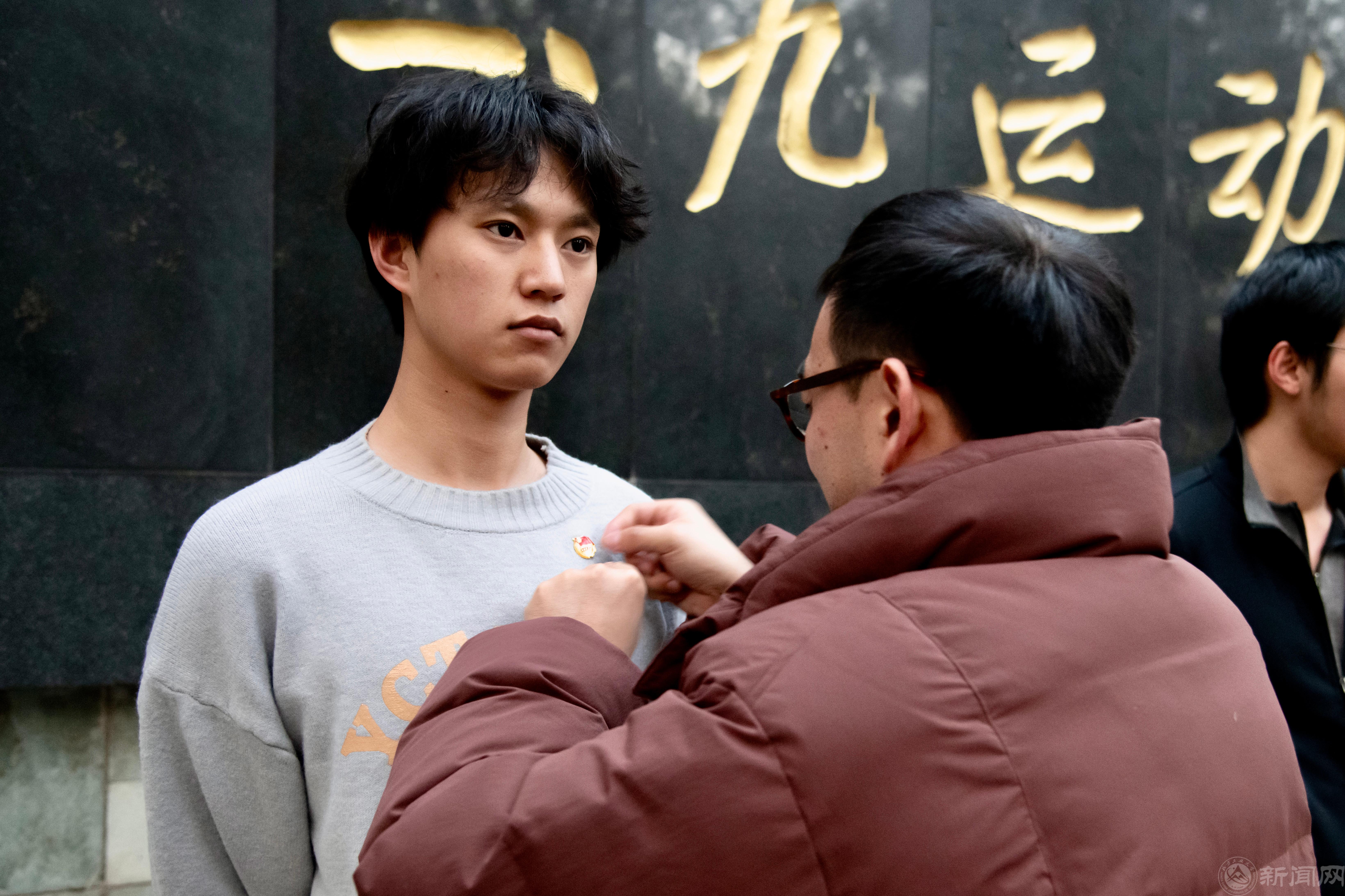 在“一二·九”运动纪念亭前,田儒基老师与范玥老师一同为新发展团员佩戴团徽,由杨成俊带领新发展团员进行入团宣誓、老团员们重温入团誓词。