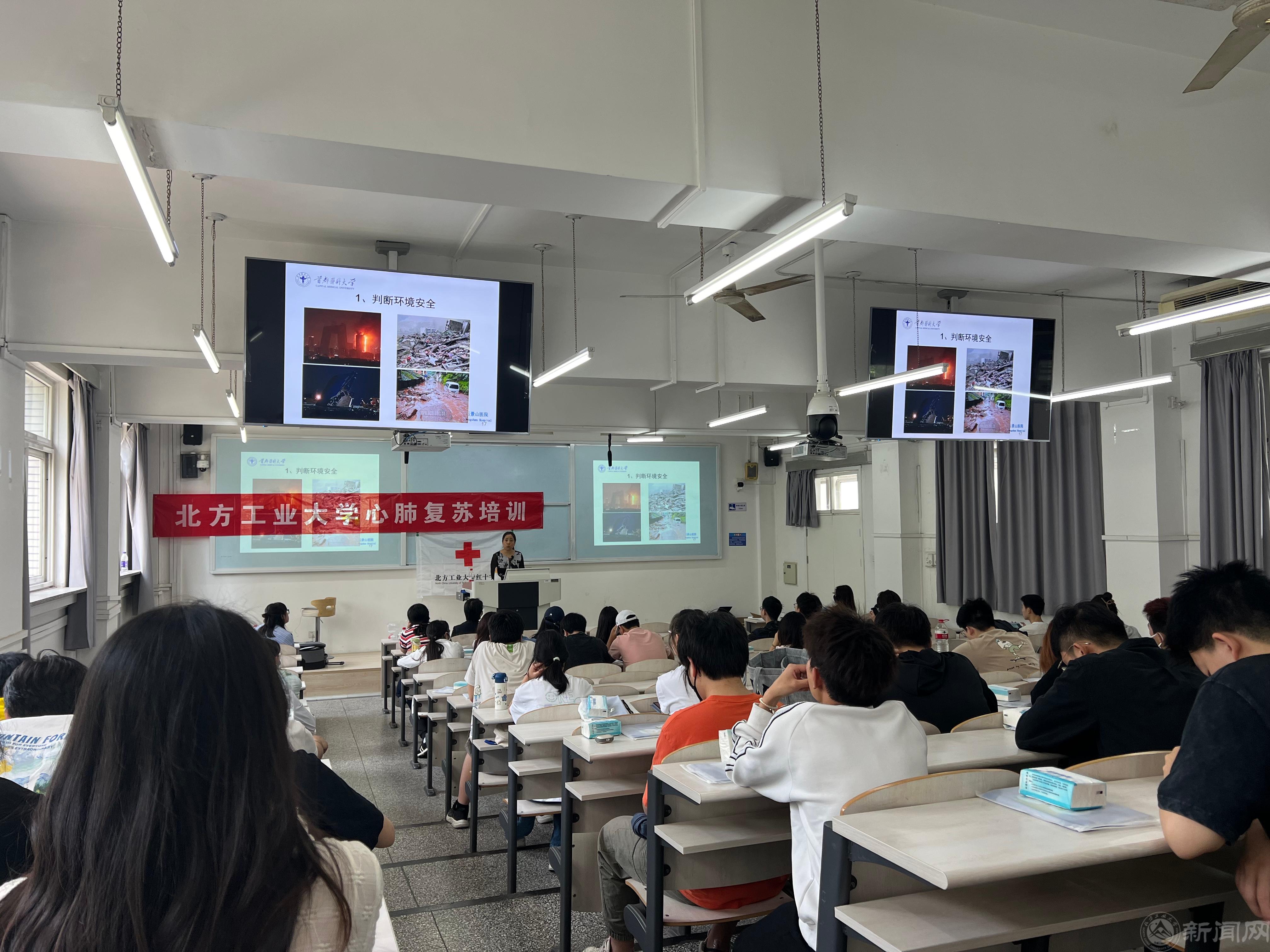 本次培训采取集中理论授课和现场实操结合的方式。北京市石景山医院急诊科倪诤主任以“黄金四分钟”为切入点,指出患者在发生呼吸心跳骤停时最好在4分钟内给予抢救,学会紧急处理就显得尤为重要。她结合实际案例,详细讲解了心脏骤停的临床表现、开展心肺复苏的适应证及心肺复苏的操作流程,主要包括如何正确判断意识状态、实施心肺复苏术、进行呼吸道异物梗阻的急救等。生动地讲解让同学们对急救技能有了全面地理解。