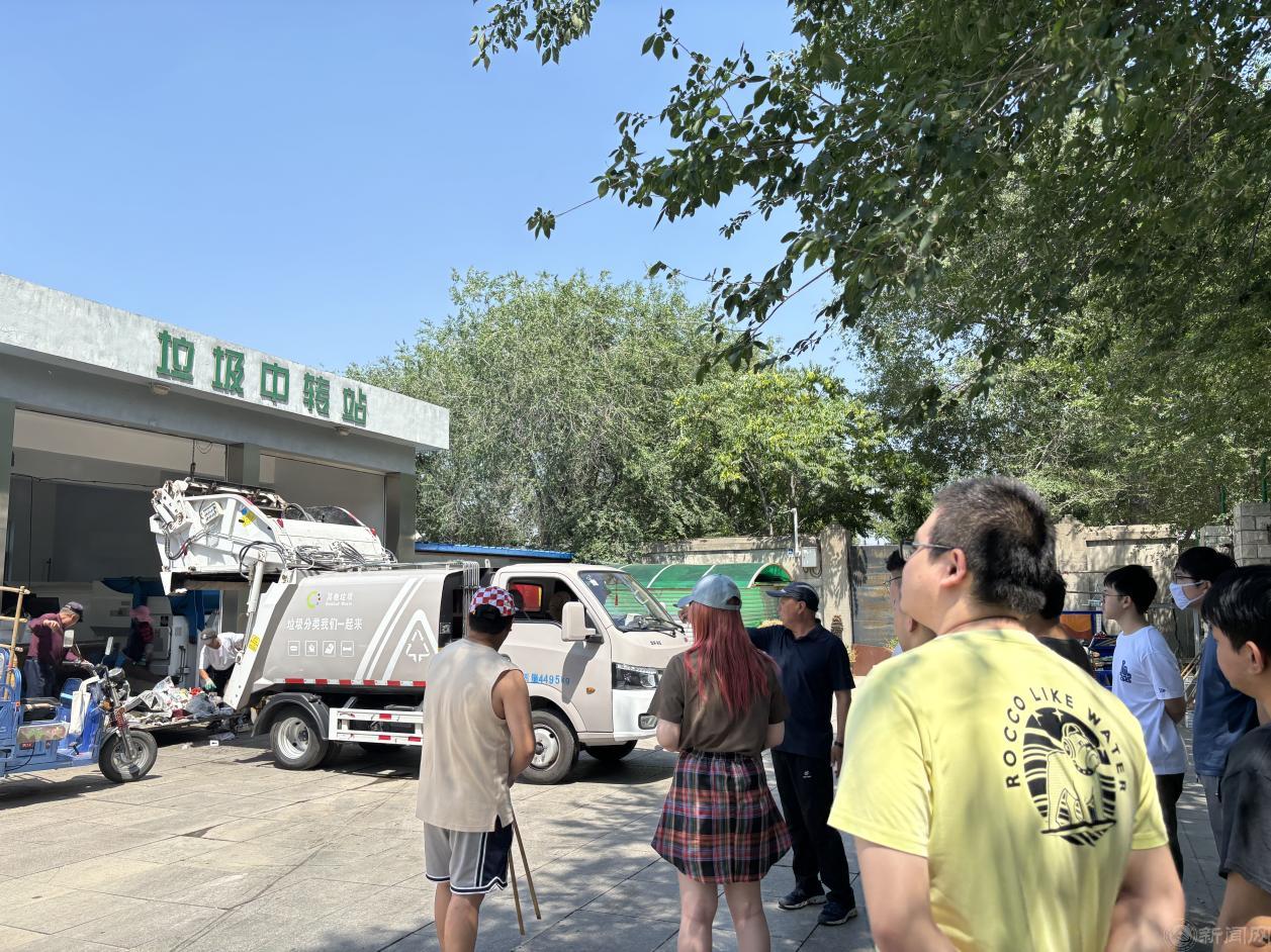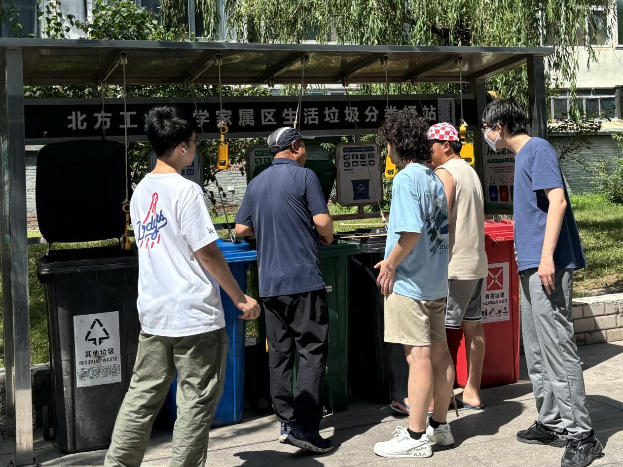 实践环节,在环卫师傅的引导下,同学们实地参观了校园垃圾中转站,了解校内生活垃圾处理流程。同学们三五成组,在家属区楼周围的分类垃圾桶站参与垃圾分类实践活动,大家发现了一些分类错误的垃圾,他们不怕脏、不怕累,伸手、弯腰分拣错误投放的垃圾。上手实操的过程,让同学们体会到了创建绿色校园的不易,也进一步增强了环保理念和低碳意识。