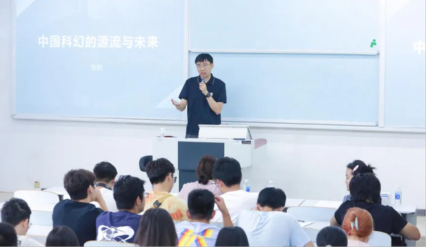 讲座中,宝树老师带领现场的同学们穿越历史长河,探索从西方科幻到中国科幻的发展历程与现状,从世界上第一本科幻小说《科学怪人》讲到十九世纪工业革命时期科幻小说的黄金时代,再到二十世纪量子力学、相对论等科技革命对科幻文学的深刻影响,让同学们对西方科幻有了更加全面且深入的了解。在讲述中国科幻的发展历程时,宝树从鲁迅翻译凡尔纳作品开始讲起,介绍了从晚清时期到21世纪科幻文学的发展,鼓励同学们要敢于想象并积极投身科幻创作之中。