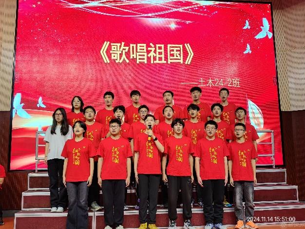 随着《保卫黄河》激昂的旋律响起,比赛正式拉开帷幕,瞬间点燃了在场师生澎湃激情。《没有共产党就没有新中国》《我的祖国》《歌唱祖国》《走进新时代》《我爱你中国》《我和我的祖国》以及《不忘初心》等经典歌曲依次上演,生动描绘了中华民族从崛起到富裕再到强大的壮丽历程,赞颂了祖国在政治、经济、科技和文化等诸多领域取得的辉煌成就。大赛以歌曲《明天会更好》收尾,传递出同学们对祖国未来更加繁荣昌盛的深切期盼。活动中,同学们满怀激情地高唱,充分表达了对党和祖国的深厚感情和浓浓祝福,同时也展示了土木学子强烈的集体荣誉感和积极向上的精神风貌。