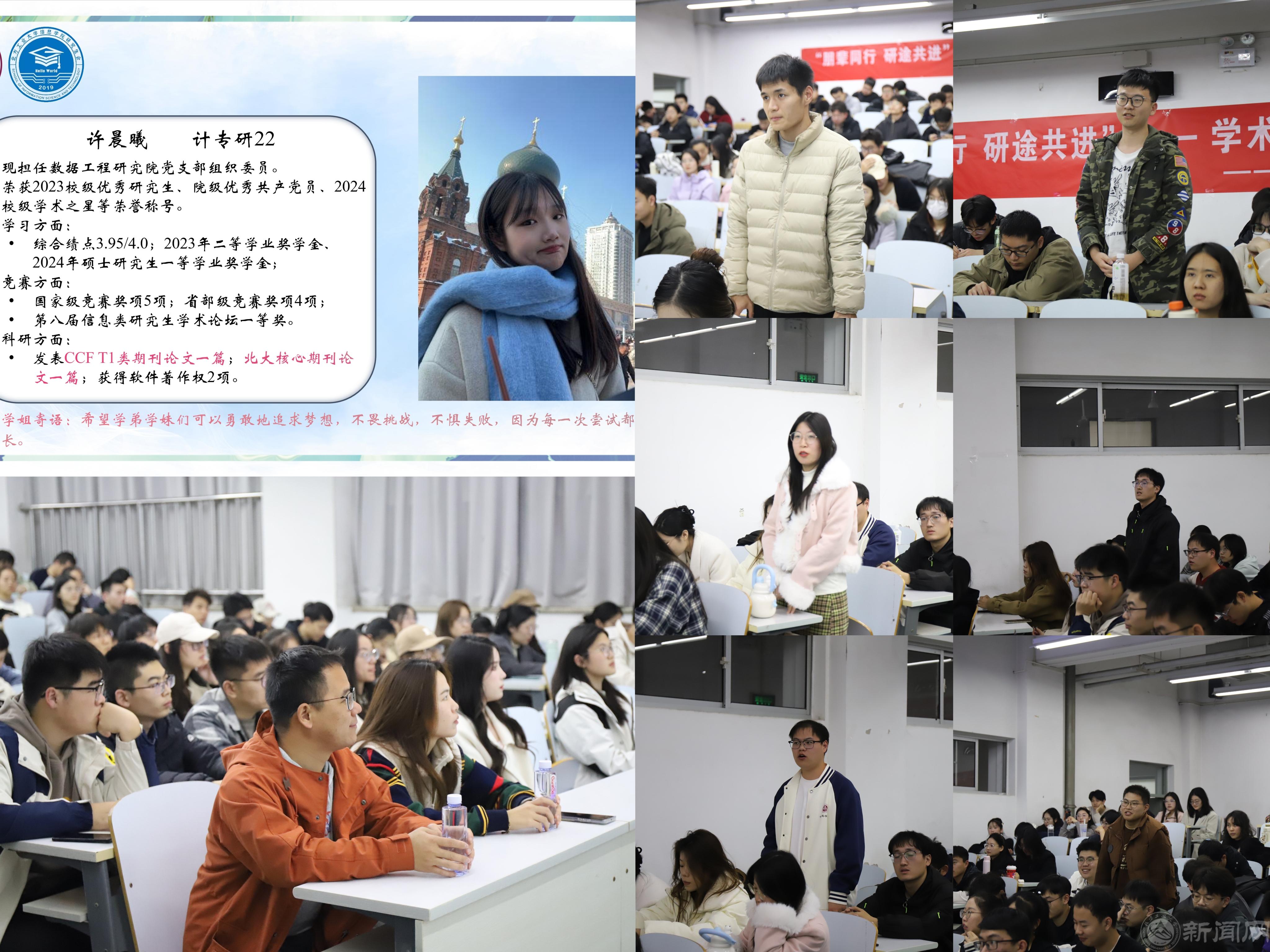 为进一步发挥榜样力量,增强学院研究生的科研动力,拓宽同学们的竞赛视野,信息学院于11月上旬举办了“朋辈同行 研途共进”研究生学术启蒙系列活动。活动邀请了学院研究生国奖得主为研一、研二同学分享经验,加强朋辈学术交流,营造良好学术氛围,信息学院各年级近400余名研究生参与本次系列活动。