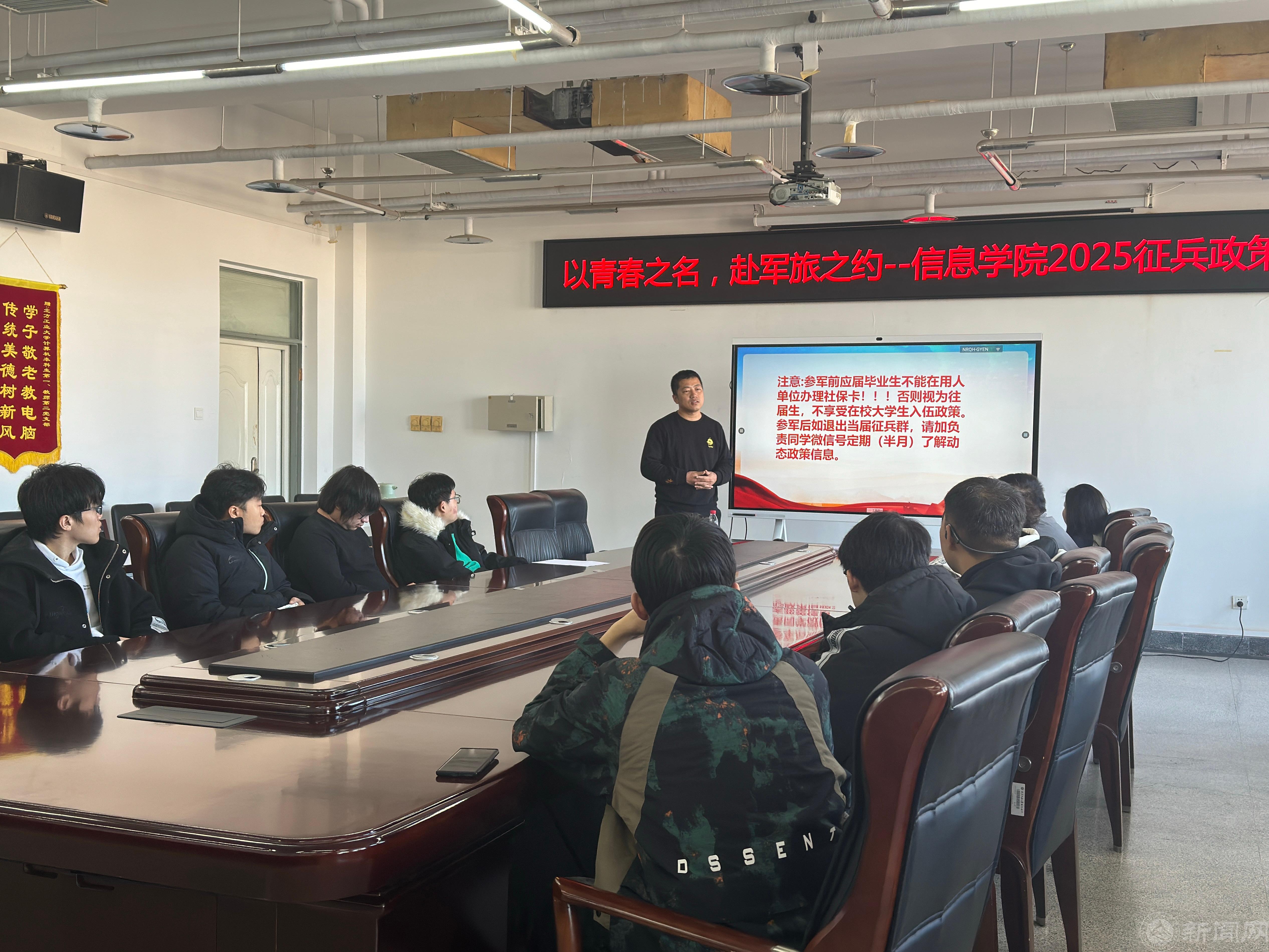 为切实做好2025届毕业生就业指导服务工作,帮助毕业生了解当前就业形势和政策,鼓励毕业生投身国防事业,拓宽2025届毕业生就业渠道。2024年12月17日,信息学院在瀚学楼1014组织开展2025届毕业生的征兵政策宣讲会,本次政策宣讲会由武装部苏宁老师主讲,2025届毕业生辅导员魏静、田庆玥以及2025届征兵意向毕业生代表参加。