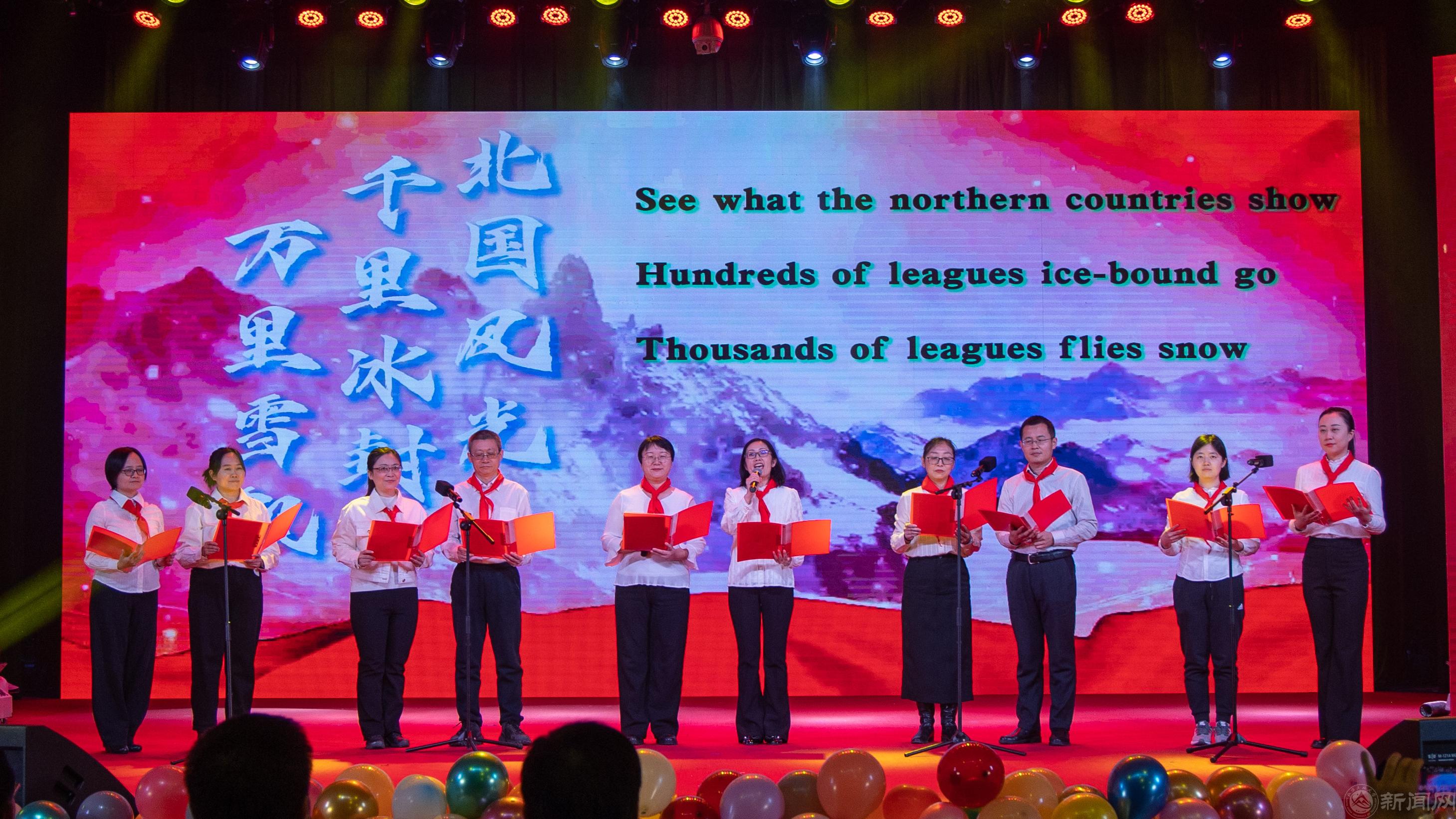 在递章“转时空∙豪迈中国”中,英语系教师带来了双语朗诵《沁园春∙雪》,校大学生艺术团合唱分团的同学们演唱了《各族人民歌唱毛主席》,日语系师生带来了歌曲《如愿》,深情地向以毛泽东同志为代表的革命先辈们表达崇高敬意与缅怀。