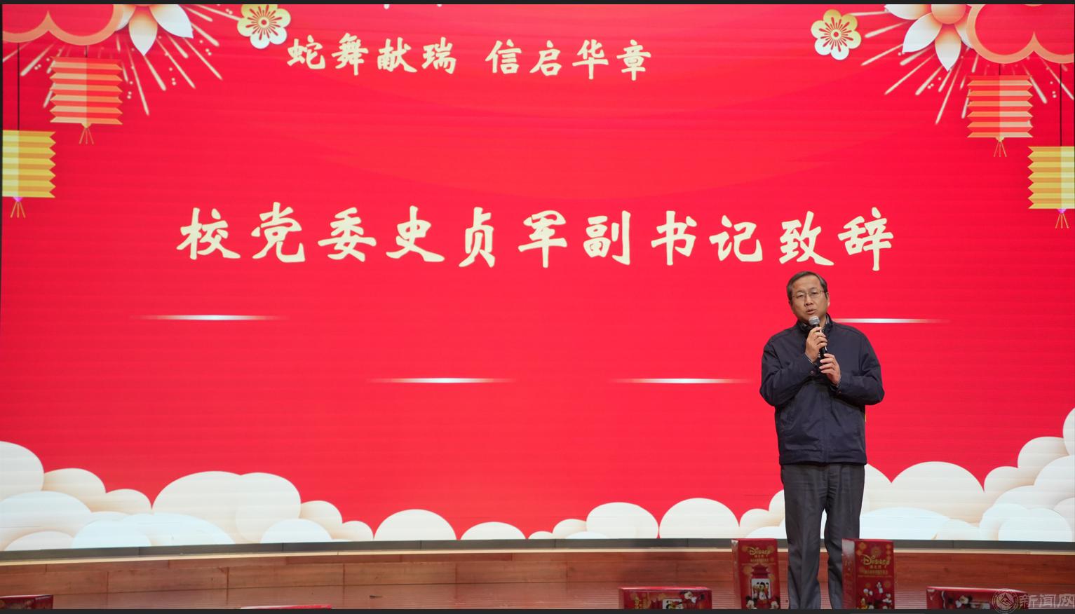 校党委副书记史贞军致新年贺辞。他代表学校向全院教师送去新春的祝福,并对一年来全体教职工为学校各项工作的辛勤付出表示感谢。他勉励大家新的一年要齐心协力,锚定目标,奋勇争先,落实好学校的各项决策部署,为学校高水平应用型大学建设做出自己应有的贡献。