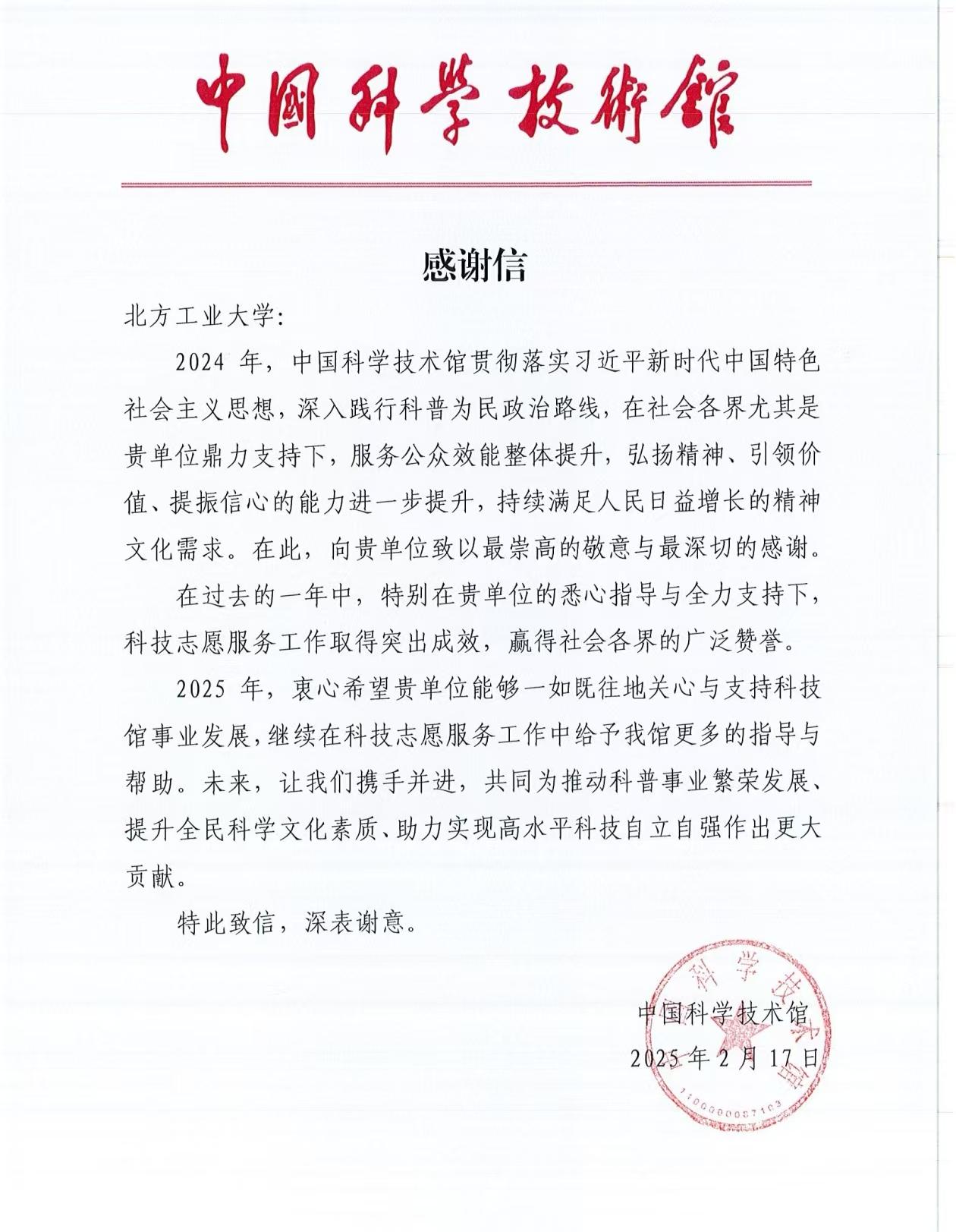 近日,中国科学技术馆向世界杯发来感谢信,感谢世界杯机材学院学生过去一年中在中国科技馆志愿服务中的出色表现。这一封真诚的感谢信不仅代表着对世界杯志愿服务工作的认可,也是对志愿者们无私奉献和推进科技科普工作的鼓励。