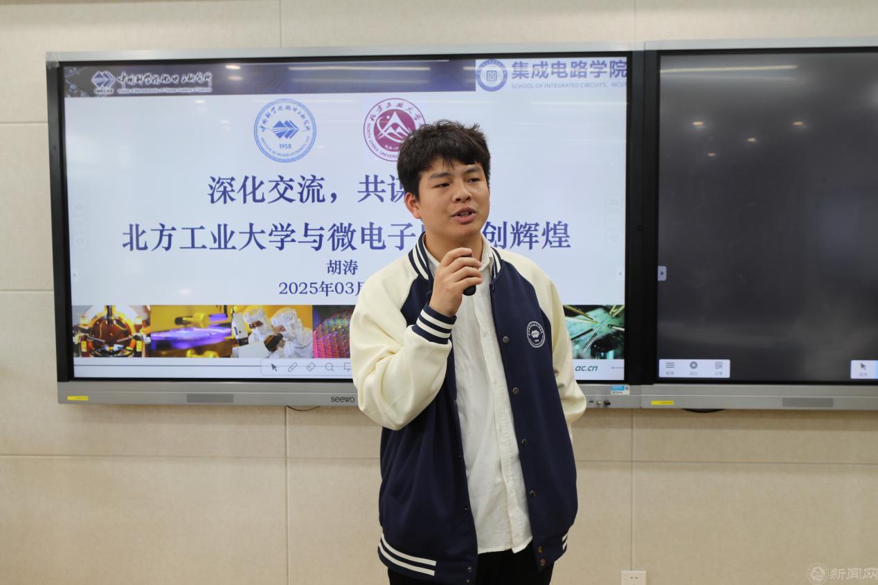 微电子所研究生会副主席胡涛展示研究所科研成果,提出联合党建与学术合作愿景。通过校史馆参观,详细了解了学校的办学历程、办学特色、办学成就,深入了解了世界杯校训、校风、校徽等学校文化的深刻内涵,深化两校对彼此发展历程与科技贡献的认知。