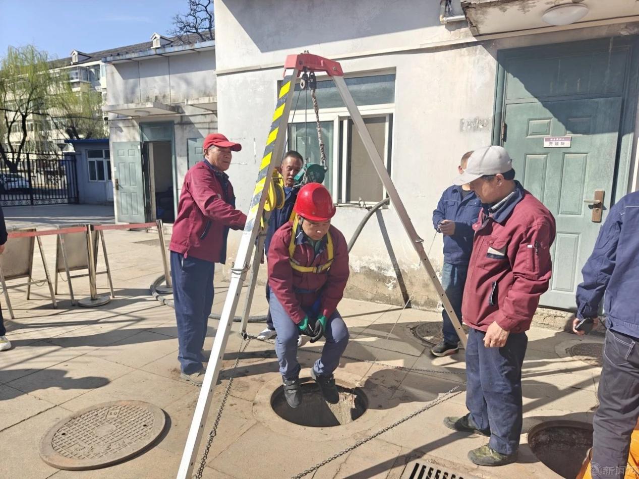 演练模拟场景设定为污水井清淤作业时突发“有毒气体中毒”险情。作业人员严格履行作业审批流程下井作业清掏污物,监护员发现作业人员“中毒昏迷”后,立即启动应急预案,及时上报险情,同步设置警戒区、开启井盖强制通风。救援组利用三脚架、安全绳并佩戴防护装备和对讲机下井救援,将伤员转移至通风区域,实施心肺复苏等急救措施。监护人员实时监测井下气体浓度,确保救援环境安全。