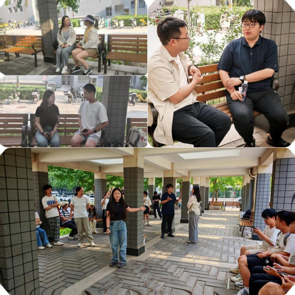 槐荫渐浓,蝉鸣初起。6月18日,人工智能与计算机学院“青访楷模”社会实践团在学校钟秀广场长廊举办了一场别开生面的校友访谈活动。计20-1班毕业校友刘胤哲(原班长)、王然(原团支书)、李嘉仪(原体育委员)与在校生代表齐聚一堂,同时通过线上连线的方式与正在工作的校友计20-2班原班长于恒进行了实时交流。计24-1班、计24-2班和计实验24班的实践团成员全程参与活动。