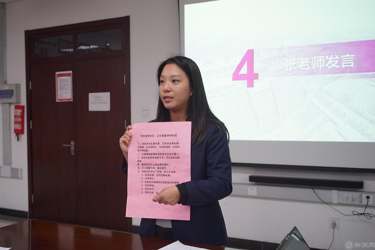 公寓管理部门张雪老师以“规范+引导”为核心,系统解读宿舍卫生标准、安全管理细则与行为规范,既明确考核要求,更强调卫生安全与身心健康、集体生活的关联,引导新生树立规则意识与集体责任感,为宿舍文化建设奠定基础。