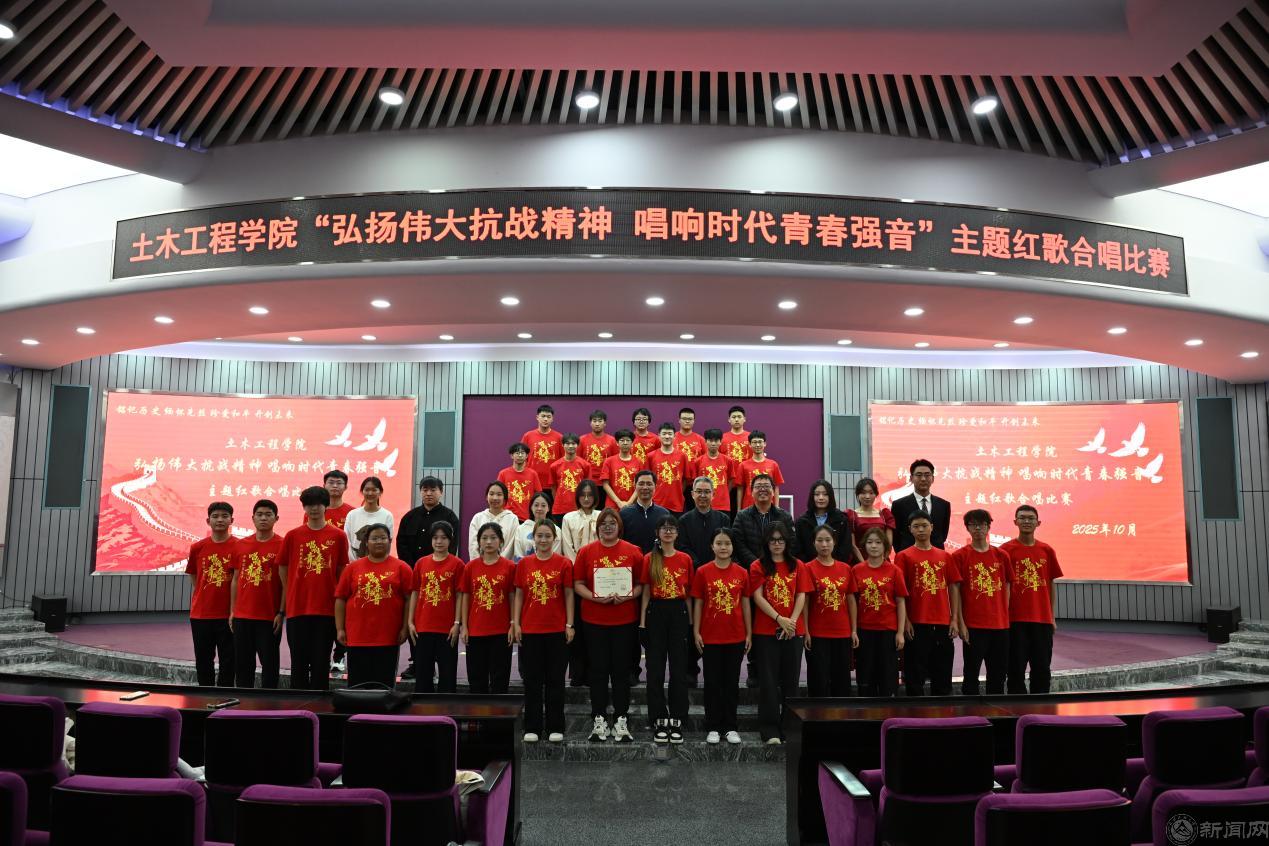 为纪念中国人民抗日战争暨世界反法西斯战争胜利80周年,继续推进学生思想政治教育和新生引航工程,传承和弘扬伟大抗战精神,激发爱国情怀,凝聚青春力量,10月23日,土木工程学院在广学楼报告厅举办了以“弘扬伟大抗战精神,唱响时代青春强音”为主题的红歌合唱比赛。学院党委书记张少波、副书记冯少杰、团委书记金磊、2025级新生辅导员、班导师以及全体新生共同参与了此次活动。