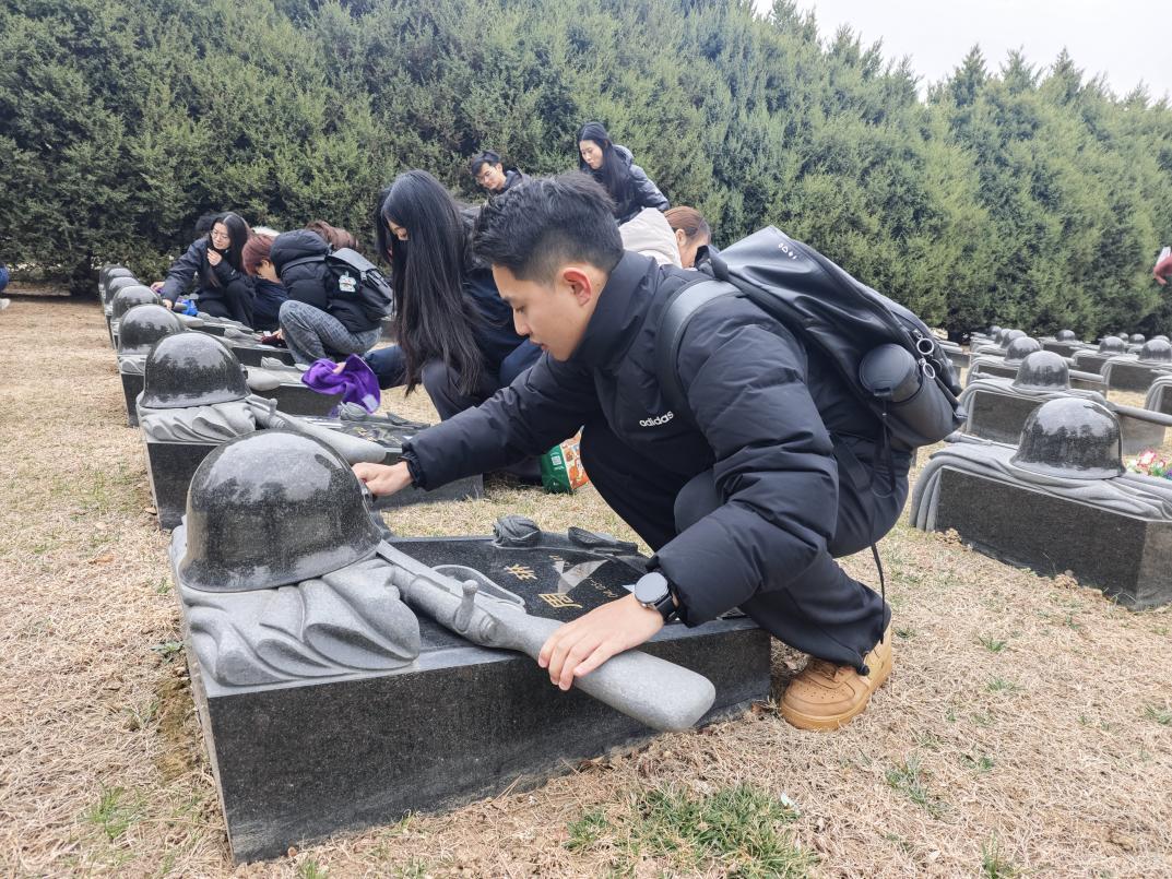 缓步走入庄严肃穆的烈士墓区,全体人员整装肃立,低头默哀,向为民族独立、人民解放英勇献身的革命英烈致以最深切的追思。默哀毕,同学们纷纷俯身擦拭墓碑、清扫落叶,用最朴素的方式表达对英烈的敬意,也在躬身实践中体悟雷锋精神的时代温度。