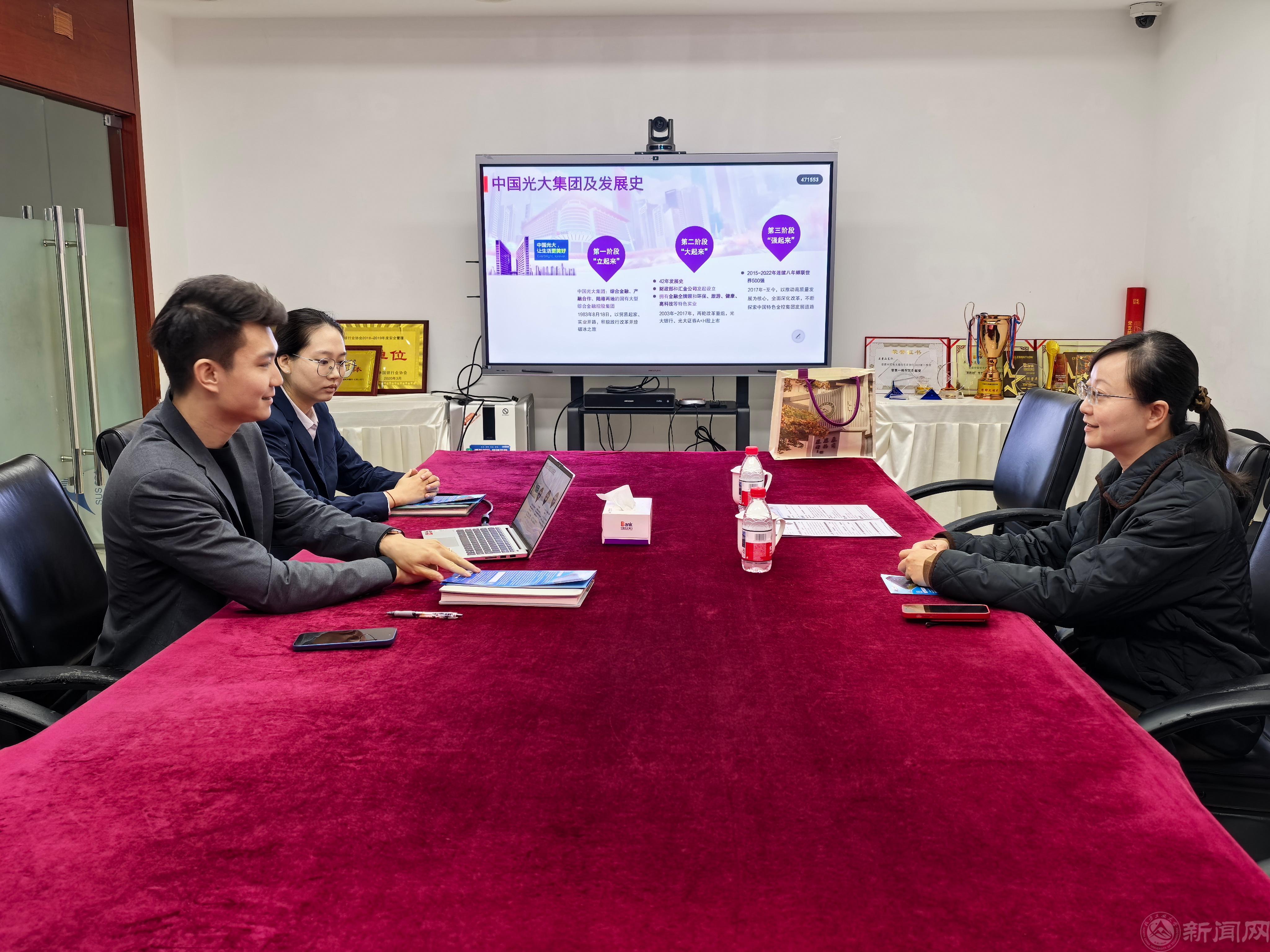 活动期间,理学院党委书记杨嵩松、辅导员熊敏前往光大银行,向企业推荐了十余份优秀学生简历,并就人才招聘、实习实践等事宜进行交流。双方深入对接金融行业对理学院相关专业毕业生的用人需求,重点围绕统计学、信息与计算科学等专业的人才培养与岗位适配进行交流,为后续进一步合作奠定基础。