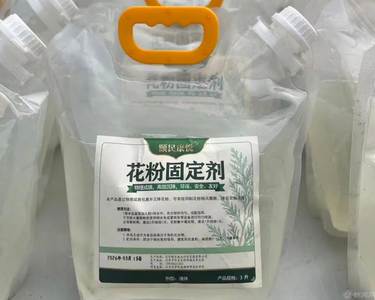 此次采用的花粉凝固剂为环保型生物制剂,主要成分为植物提取物,无毒无害、无残留。该制剂通过连续喷洒在圆柏枝叶及雄球花表面形成一层可降解保护膜,阻碍花粉成熟后随风释放,相比传统洒水降尘更持久、更精准。