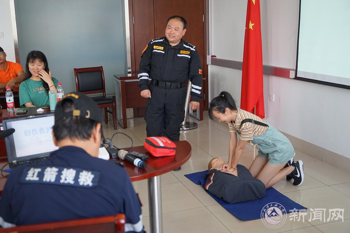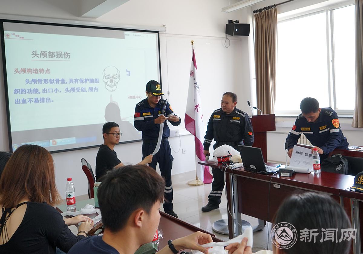 活动中,三位教官以讲座的方式向大家介绍紧急救援的基本理论知识,并亲自示范。现场互动心肺复苏术、介绍自动体外除颤仪AED的使用、演示伤口包扎。之后还手把手地对同学们进行了培训,同学们亲自体验了心肺复苏术的手法、学习了伤口包扎的方法。