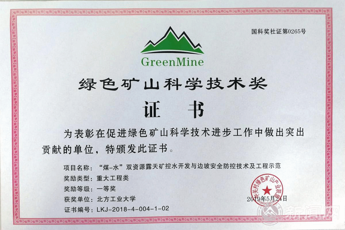5月23--26日在重庆召开的第二届绿色矿业发展大会上,由世界杯土木工程学院王振伟教授负责,孙世国教授、宋志飞教授、何振军副教授参与完成的 “‘煤-水’双资源露天矿控水开发与边坡安全防控技术及示范工程”项目,获2018年绿色矿山科学技术奖一等奖。