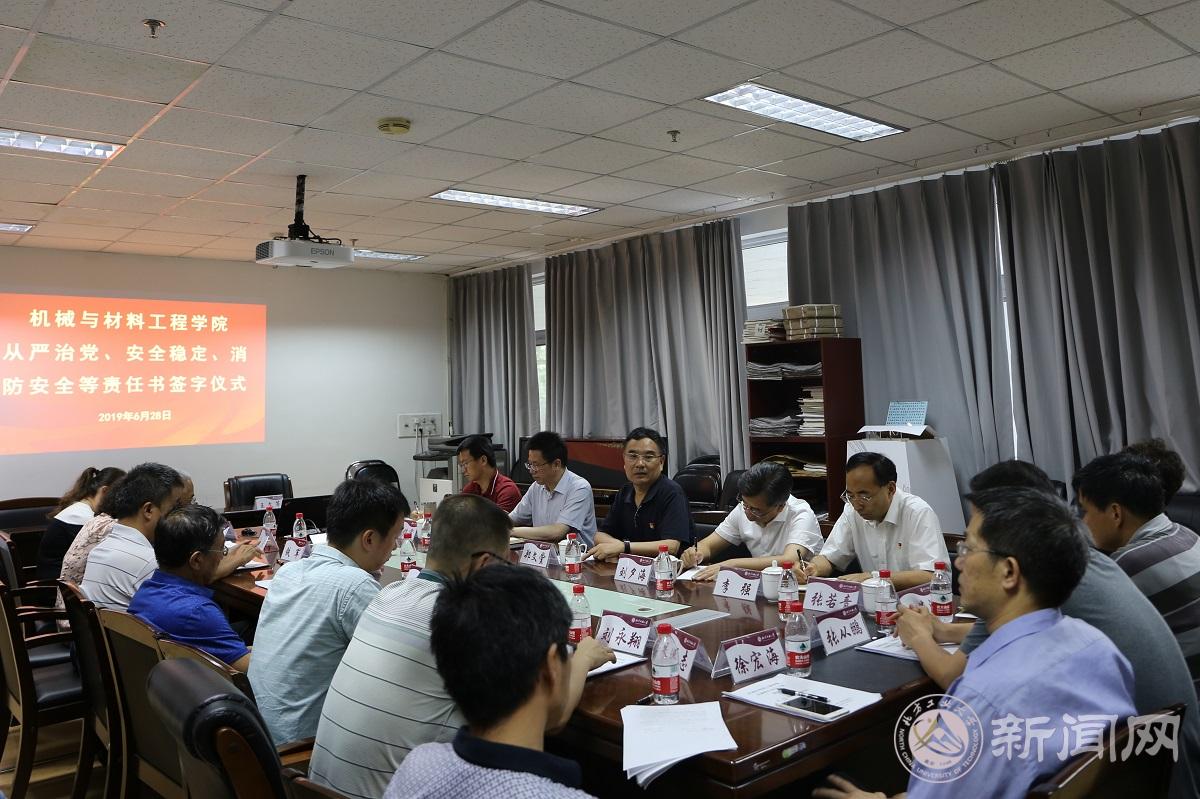 6月28日,机材学院在(博闻楼203)举行从严治党责任书暨承诺书、维护安全稳定工作责任分解任务书、消防安全责任书签订仪式。校党委书记郑文堂出席仪式,并对机材学院发展进行指导。