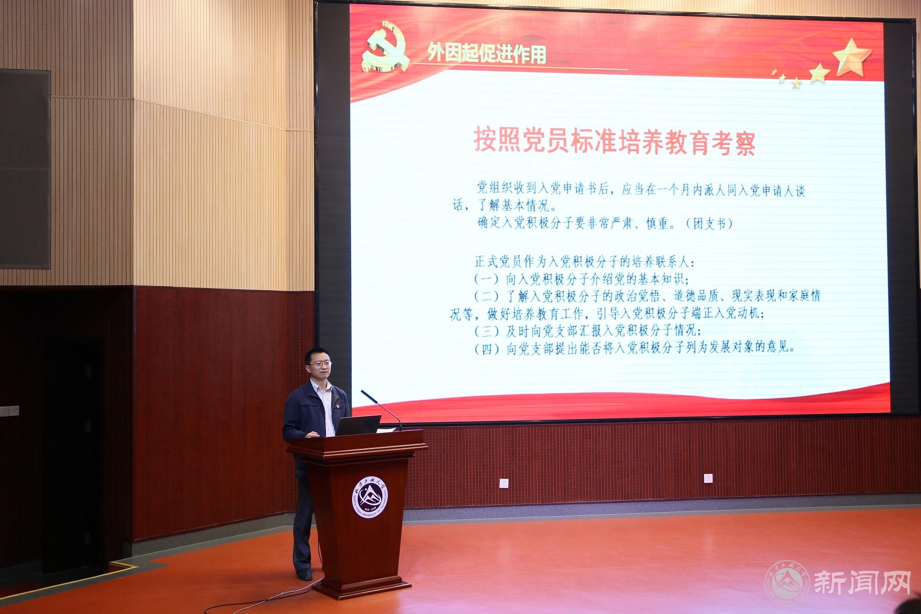 会上,隋俊宇副书记首先提出自己对主题的理解,随后提出四个问题:党为什么能?为什么要加入党?怎么做才能加入党?加入党后做什么?并依次向同学作出自己的回答。在整个讲座过程中,隋俊宇副书记提到了信仰,并引用习近平主席的话:“人民有信仰,民族有希望,国家有力量”,结合党的发展历史回答了第一个问题。对于第二个问题,隋俊宇副书记分别从国家、社会、个人的角度进行分析,提出了“中国的美好未来需要党,党也需要优秀的你”,并建议在场的同学们要“见贤思齐”,严格要求自己,不断追求进步。“以实际行动加入党组织”,这是隋俊宇老师对第三问作出的回答,其中包括:端正自己的入党动机,这也是争取入党的首要问题;按照党员标准要求自己,在思想上进步、学习上努力、工作上担当、生活上健康;履行《中国共产党发展党员工作细则》的手续。对于最后一个问题,隋俊宇副书记指出,我们要坚定信念追求理想,加入中国共产党是要求入党青年学生的人生追求和坚定信仰,并根据机械与材料工程学院情况提出了“党员先锋工程”的倡议。