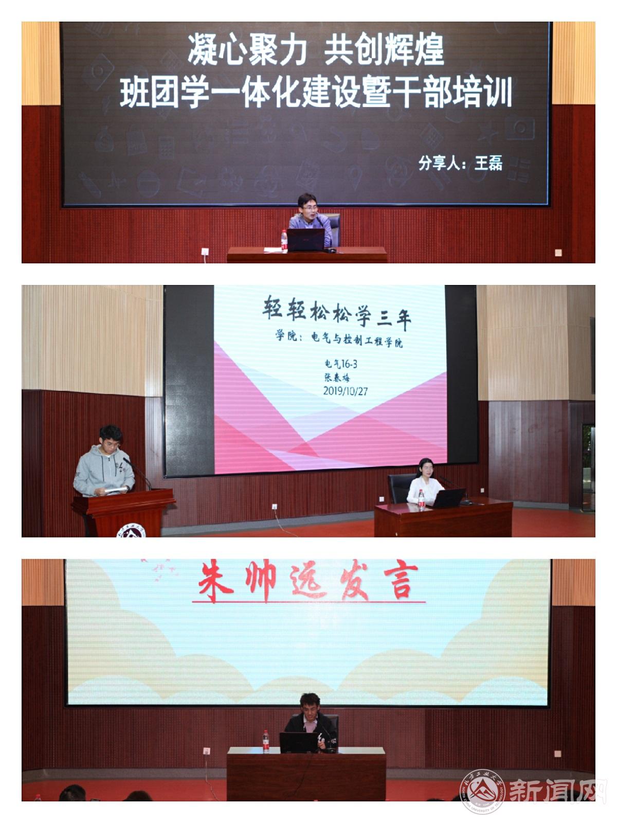 在优秀学生经验分享环节,国家奖学金获得者电气16-3班张春梅同学就学习、竞赛、实践等分享了她的经历。在分享中,她的学习成绩、所获奖项、推免经历都不时博得同学们的喝彩,激发了大家的学习热情。她告诉同学们要认清自我,明确自己的定位、能力和发展方向,在老师、同学、朋友的“助推”下,拼搏奋斗,做最好的自我。学生科技协会主席、电气17-4班朱帅远同学分享了他在团学、党支部的工作经验,他认为,学生干部首先要做好自己的本职工作,把每一项任务都认真完成好。同时,每个人都应该担负起自己身为学生干部的职责,为同学们做好服务。关于实践,他认为专业竞赛可以锻炼自我,并且可以系统的学习和发现自己的兴趣所在。