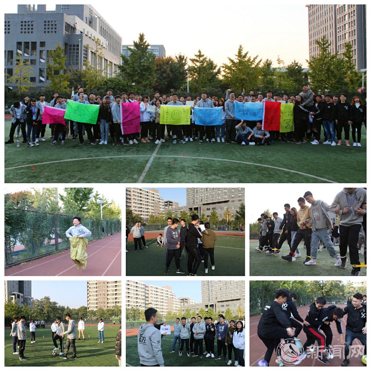 下午,同学们从文化会堂转移到小操场进行了素质拓展活动。在该环节,全体人员随机分为8支队伍,互相进行比拼,各环节用时相加,用时最短的队伍获胜。这是一场脑力与体力的比拼,“你猜,我猜,大家猜”、“同舟共济”、“盲人足球”、“袋鼠接力”、“踩气球”等一系列小活动增强了大家的团队意识和凝聚力。