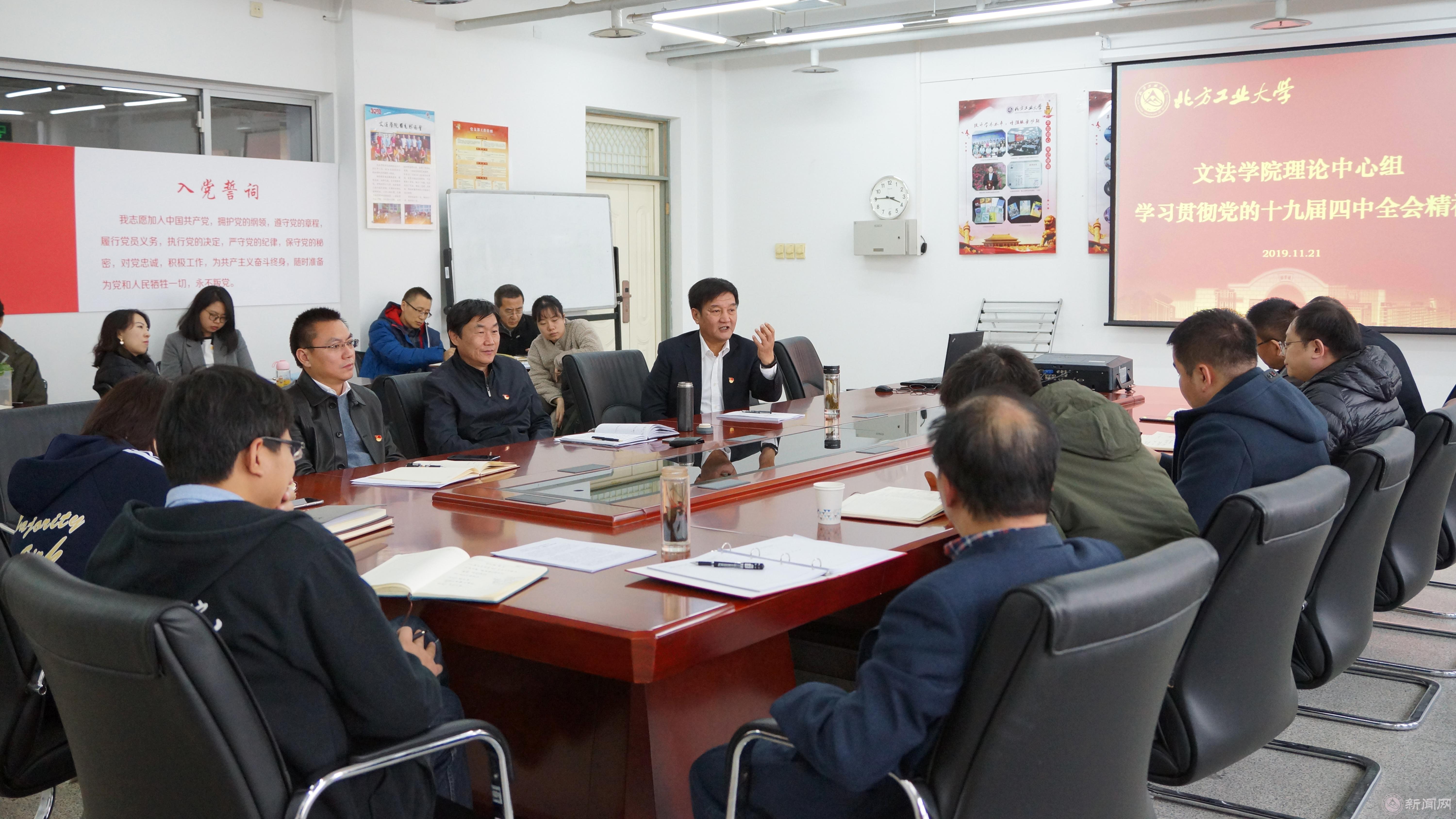 会上,刘泽军院长带领大家一起学习了《中国共产党第十九届中央委员会第四次全体会议公报》和《中共中央关于坚持和完善中国特色社会主义制度、推进国家治理体系和治理能力现代化若干重大问题的决定》,并从专业角度,以资深法律人的视角,对《公报》和《决定》中有关中国特色社会主义法治体系、社会主义法治国家和中国法律治理体系建设等内容进行了解读,并结合学术研究和教学工作,跟大家一起探讨如何在学习党的十九届四中全会精神中找到我们文法人的发力点和落脚点。刘院长强调,改革开放40年来,我国法律制度体系更加清晰,执行层面也更加完善。我国既从外部法律制度层面不断拓展规则完备之路,又通过内控机制调节政府之权力,这种治理方式的优势在党的十九届四中全会精神中充分体现出来。在这个过程中能够更加清晰地看到我们学术研究的落脚点——“中国之治”。在学术研究的过程中,我们要注重跟进主旋律,运用中国话语,梳理中国经验,探索中国模式,要在不断积累过程中形成自身的学术特点和研究特色。