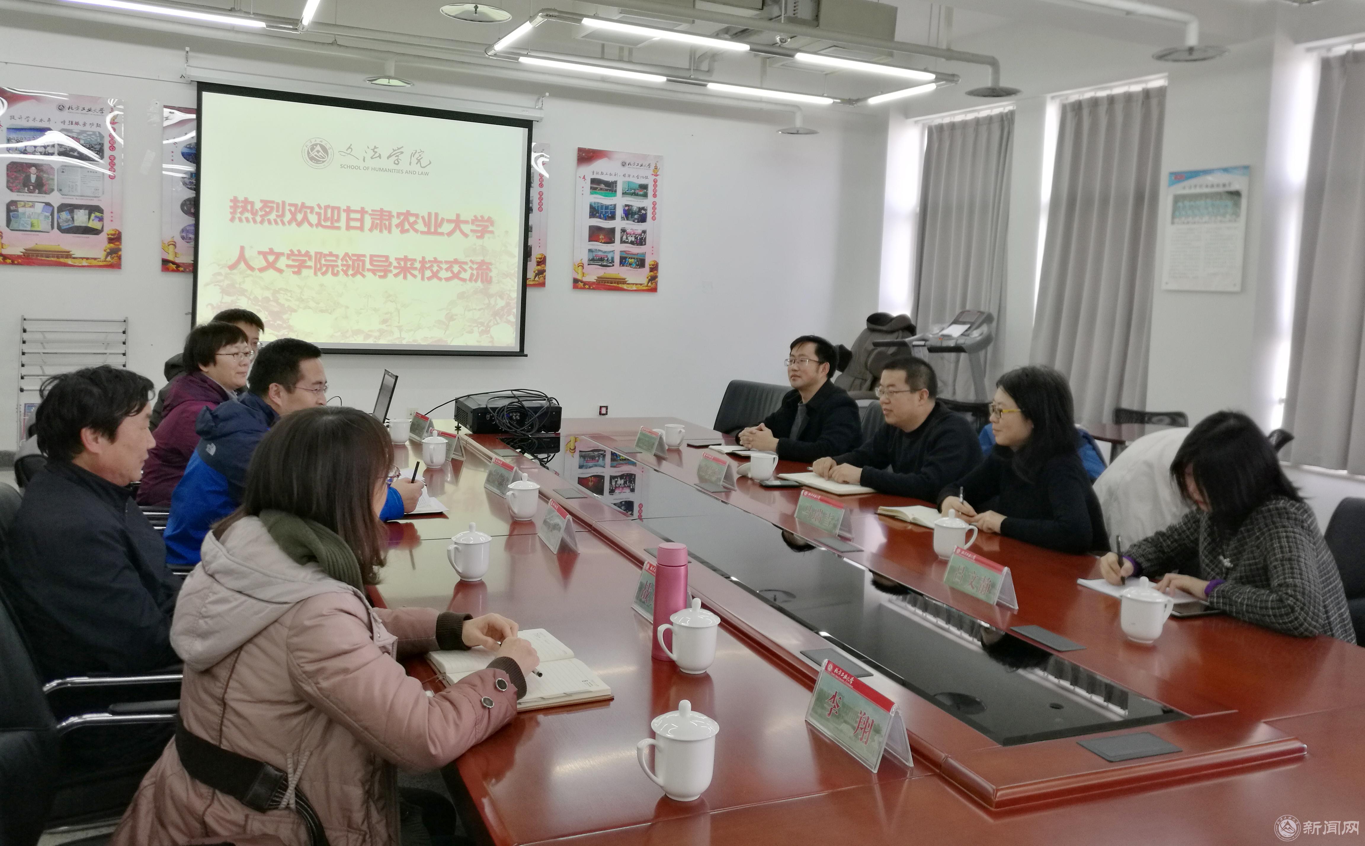 12月17日下午,甘肃农业大学人文学院英语系马瑞雪主任一行4人来世界杯调研英语专业教学与大学英语教学改革工作。文法学院党委书记袁本文、副院长袁凤识、公共英语系主任高越、副主任战凤梅、英语系教师李翔及高黎老师参加了会谈。